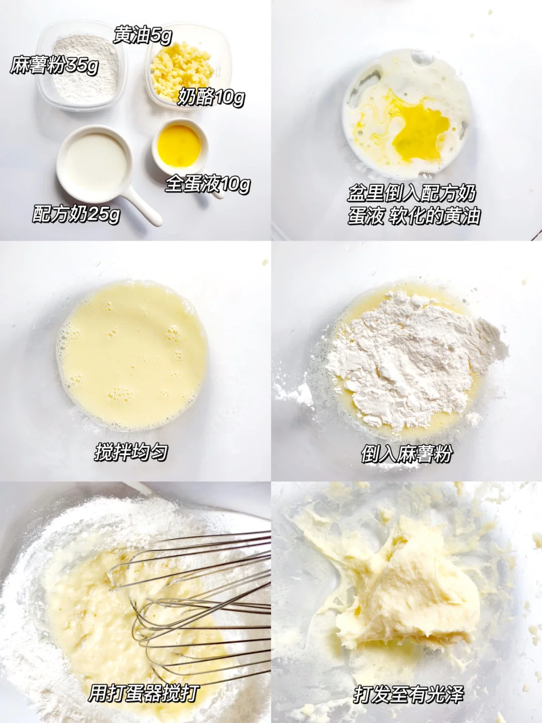 黄油5克、麻薯粉35克、全蛋液10克、配方奶25毫升、奶酪10克