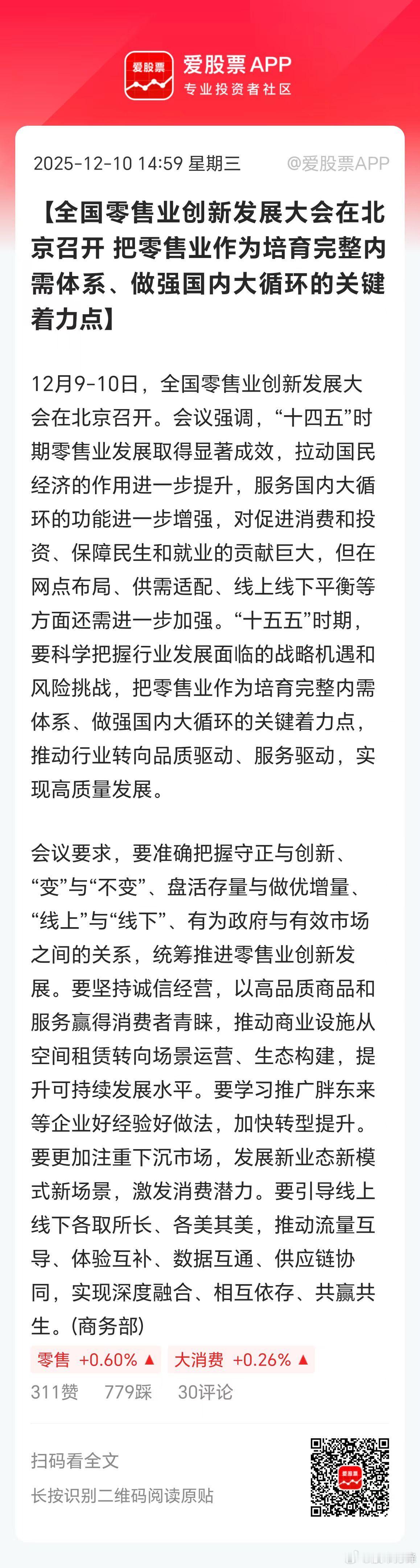 今晚消费利好依然挺多的,一是全国零售业创新发展大会在北京召开,强调零售业是做强国