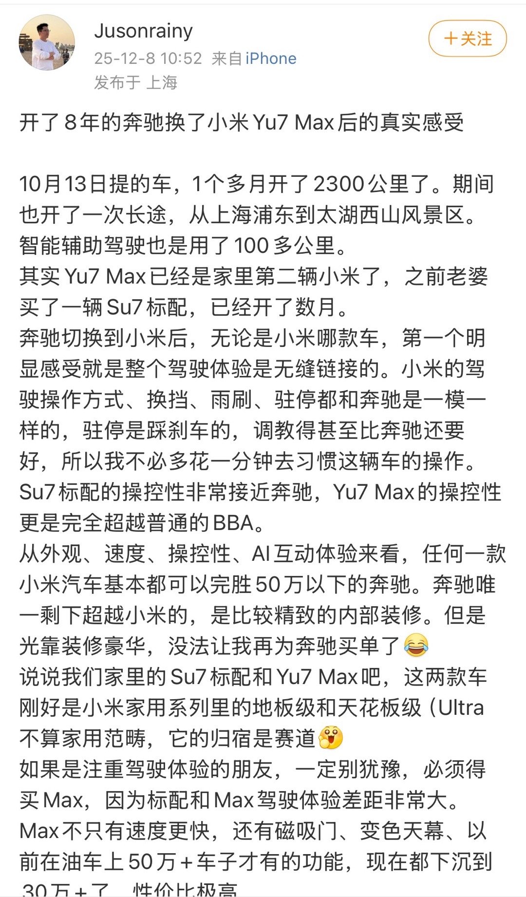 入了小米之后就回不去了,操控感太好了!我也是,开了su7之后再也不想开别的车,人车合一的感觉特别爽,车库里别的车都停好久了,下一辆车还得是小米。