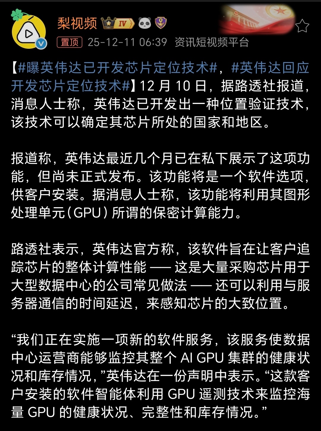 曝英伟达已开发芯片定位技术英伟达这个“芯片定位技术”,官方解释是为了让数据中心监控硬件健康与库存,但能“感知芯片大致位置”的功能,很难不让人联想到它是否是一种变相的“后门”或远程管控工具。特别是在当前背景下,这项技术如果被滥用,可能严重威胁用户的数据隐私与系统安全。全网热点共创计划