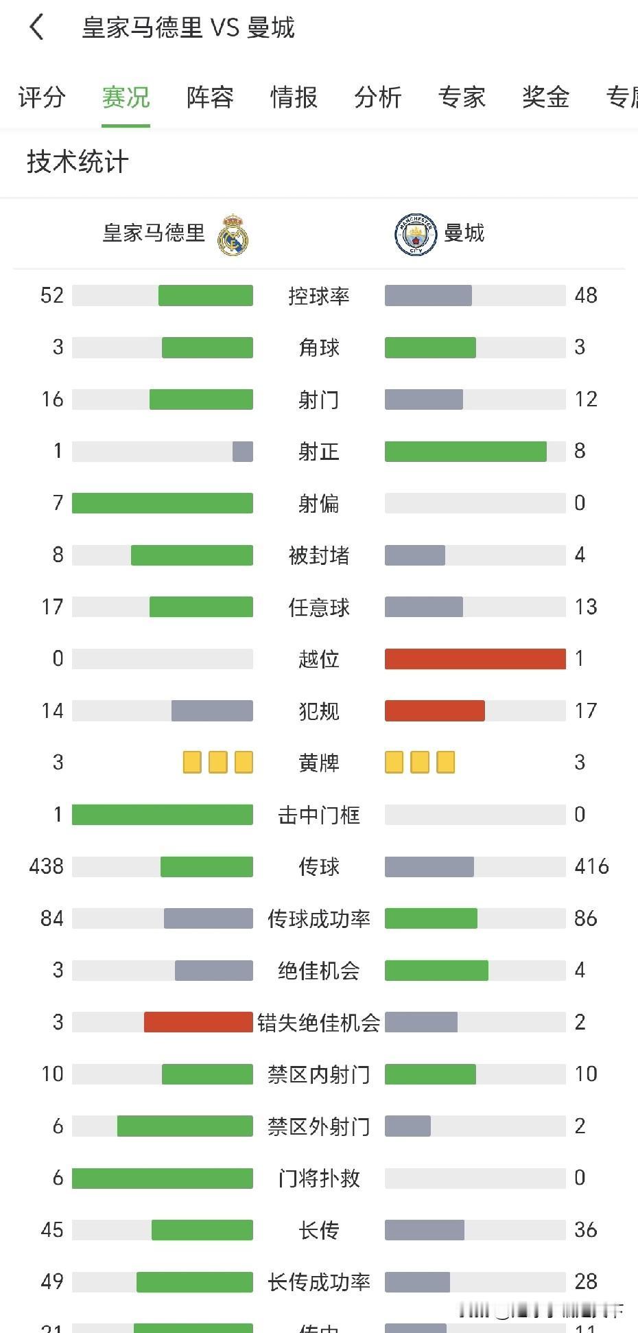 曼城真菜,踢个皇马都踢得这么艰难,还不如西甲得塞尔塔![奸笑][偷笑][呲牙] 不过话说回来,其实皇马这场比赛踢得还是不错的,特别是上半场压着曼城踢,全场下来射门次数不少,全场比赛皇马16次射门1次射正,不得不说少了姆巴佩,皇马的射门质量差了很多。 其实要不是吕迪格那次愚蠢的犯规皇马不应该输球的。话说吕迪格也是纳闷,以前这么抱都不吹犯规的,今天咋就吹了呢。[捂脸] 现在必须承认皇马这几年真是走下坡路了,以前BBC,典礼中场,再到本泽马爆发,绝境逢生一个赛季,再到现在人见人欺,真是令人唏嘘。