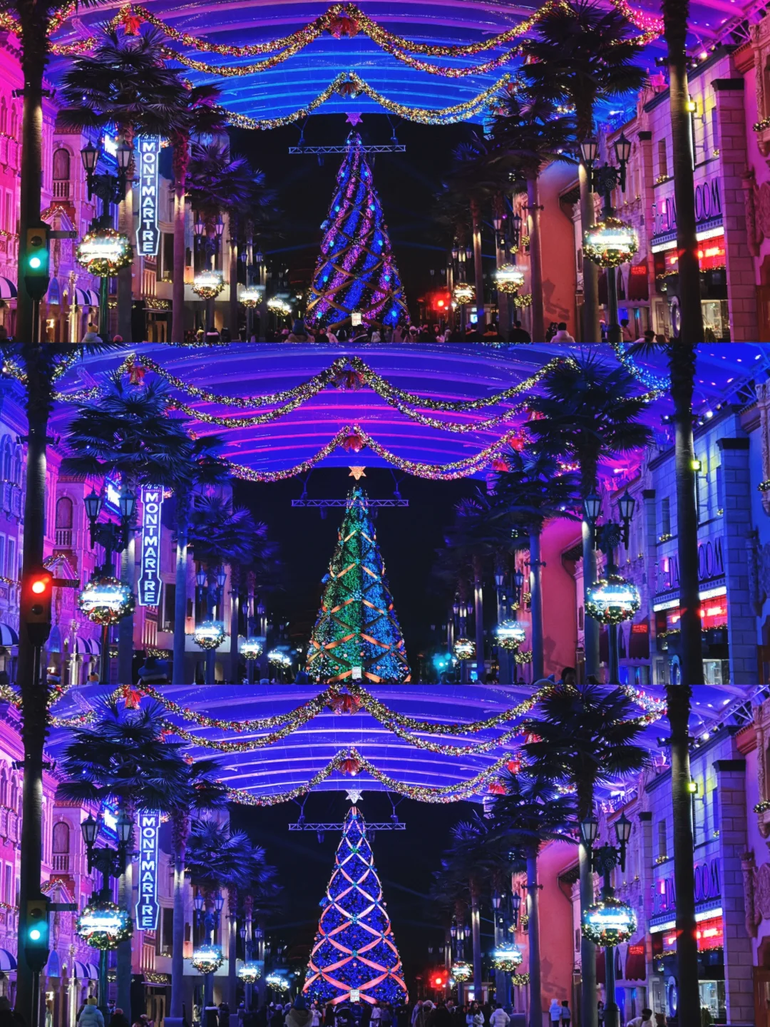 ❄当夜幕降临,灯光亮起,“雪花”伴随着音乐在空中飘舞,圣诞树上变换的灯光是它的背景,一场光影盛宴让这一刻浪漫窒息。