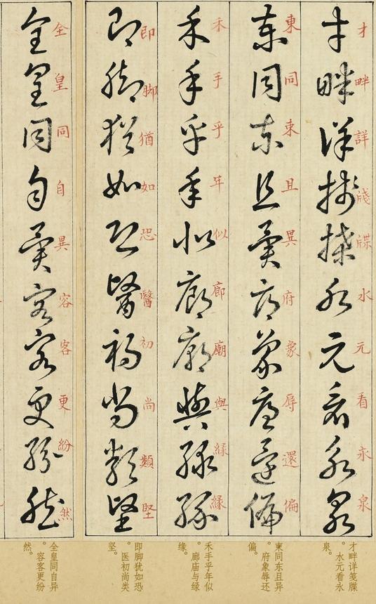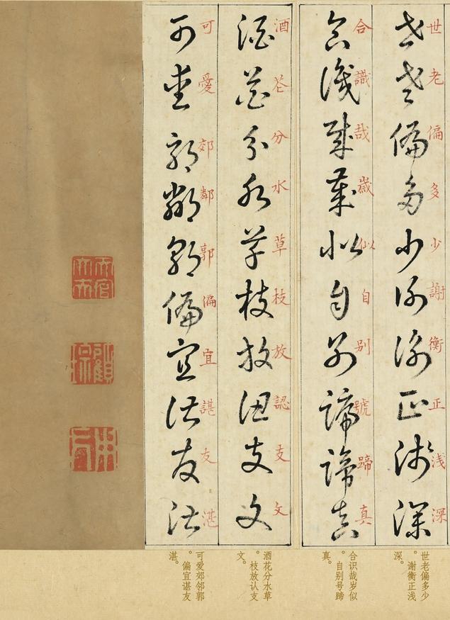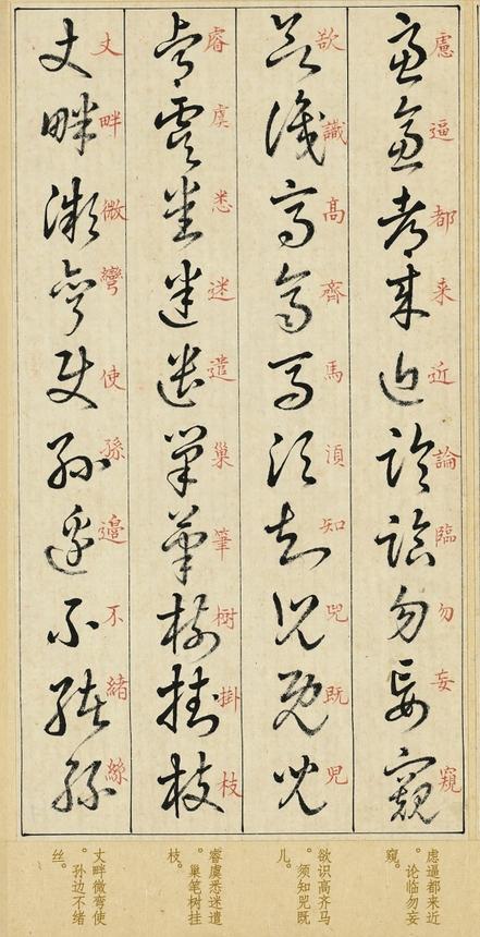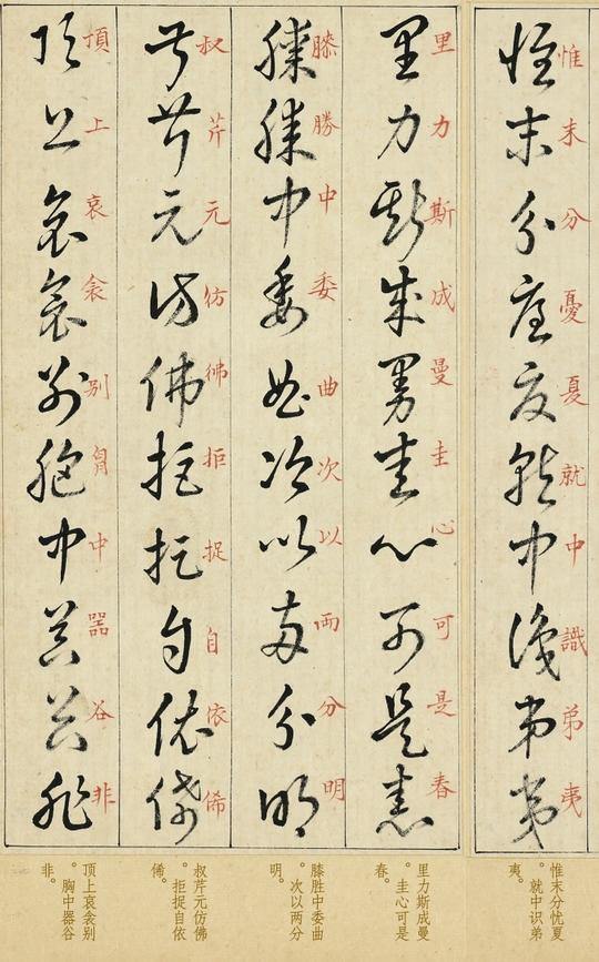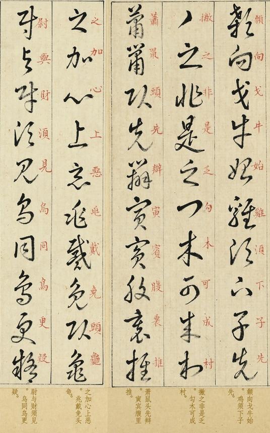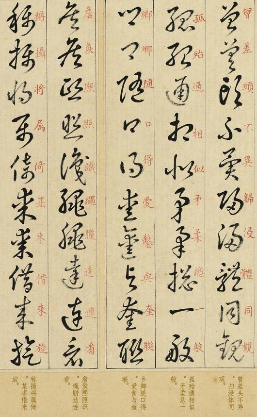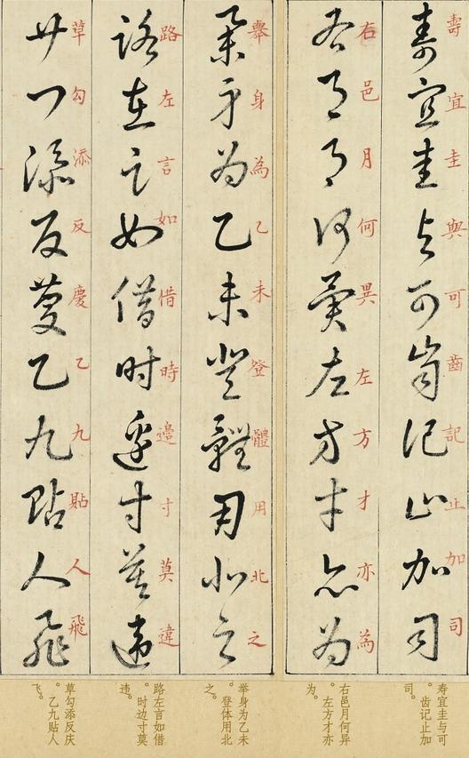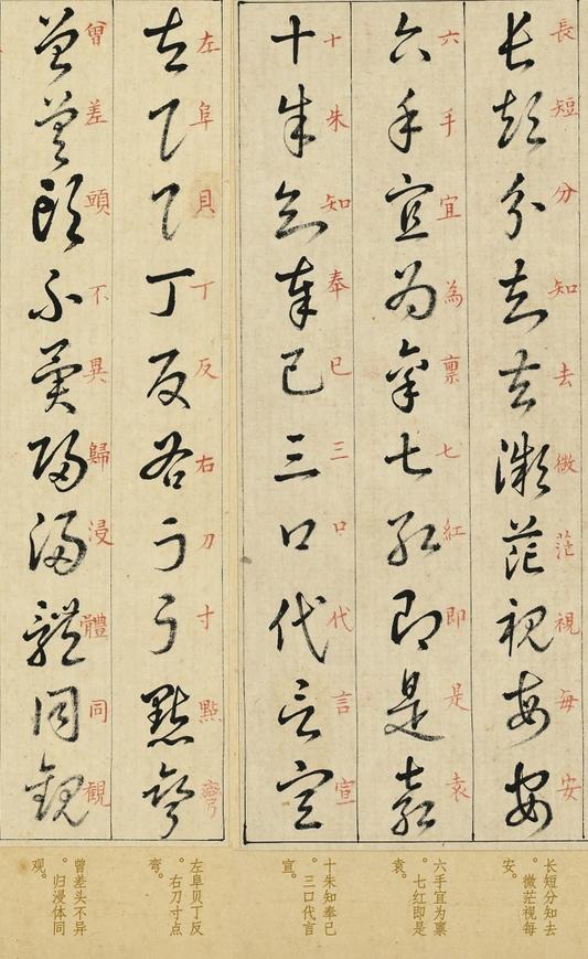 草书必学的100句口诀,由王羲之总结而成,把它搞懂才算真正入门了! 米芾曾说:“草书若不入晋人格,辄徒成下品。”历代草法以晋人最为正宗,尤其是“二王”的字,公认为今草的“正脉”与源头,张旭、怀素、黄庭坚、米芾无不朝夕苦临。如果我们想实现草书的真正入门,杜绝“江湖气”,丰富笔法技巧,提升气韵格调,就要学习晋人法帖。 王羲之在临终前曾将毕生所学传授给儿子王献之,并嘱咐他好生钻研、千金毋传。后来,智永将它公诸于世,经过宋代书家的总结,编成了一部《草诀百韵歌》。此作被誉为草书界的“宝典”“教科书”。 它有三大优点:其一是以五言律诗写成,朗朗上口、字字珠玑,便于记忆;其二是内容具体直白且包罗万象,将草书笔法、结字技巧、相似字的区分等讲得明明白白,从根源上防止我们写草书出现失误;其三是每个草书字旁都有小楷释文,楷草对应,更加直观,即使是外行也能轻松上手。 我们以其中几句为例,作一讲解:“有点方为水,空挑却是言。宀头无左畔,辵遶阙东邊。长短分知去,微茫视每安。” “水”字旁首笔为向右上的短点,第二笔为向右下的斜点,第三笔为向右上的挑笔,三笔连写时形成两点一挑的形态;而“言”为横画起笔后直接向右上挑笔,形成“空挑”的单一笔画,这两个偏旁的关键区别在于“言旁无点”。 宝盖头省略左竖画,仅保留点画和横钩,首笔为右点,随后直接写横钩,横画向右上倾斜,钩画短促有力,左边没有竖画,只保留右侧的横钩和点画。走之旁首笔点画简化为短横或斜点,随后写横折折撇,折笔处快速转换方向,最后向右上挑笔收束。 “知”“去”的区分主要通过竖画的长短来区分。“知”字竖画较长且向右倾斜,收笔时略带弧度;“去”竖画较短且直立,收笔时直接挑笔,需仔细观察竖画的长度和倾斜角度,避免混淆。 “视”“每”“安”差异在于起笔和结构,“视”左旁简化为横画加竖钩,右旁简化为横折钩,整体结构较紧凑;“每”起笔为短横,随后写竖折,折笔后向右上挑笔,中间有明显的折角;“安”宝盖头简化为右点加横钩,下方简化为撇折加挑笔,整体形态较宽扁。 由此可见,《草诀百韵歌》注重细节处的区分,草书并不是写得快、写得认不出来就代表水平高,如果不在细微处准确,那么就相当于胡写乱画了。 市面上流传的《草诀百韵歌》,多为韩道亨版本,此本存在笔路不清、细节缺失等情况,而台北故宫所藏的版本,则细腻精妙得多。 而今,我们将《草诀百韵歌》台博本进行了博物馆级的超高清1:1复制,并添加释文一一对应,便于您临摹和欣赏。如果您感兴趣,请点击下方链接一观! 王羲之草诀百韵歌 台博藏本精装版高清复刻装饰字画