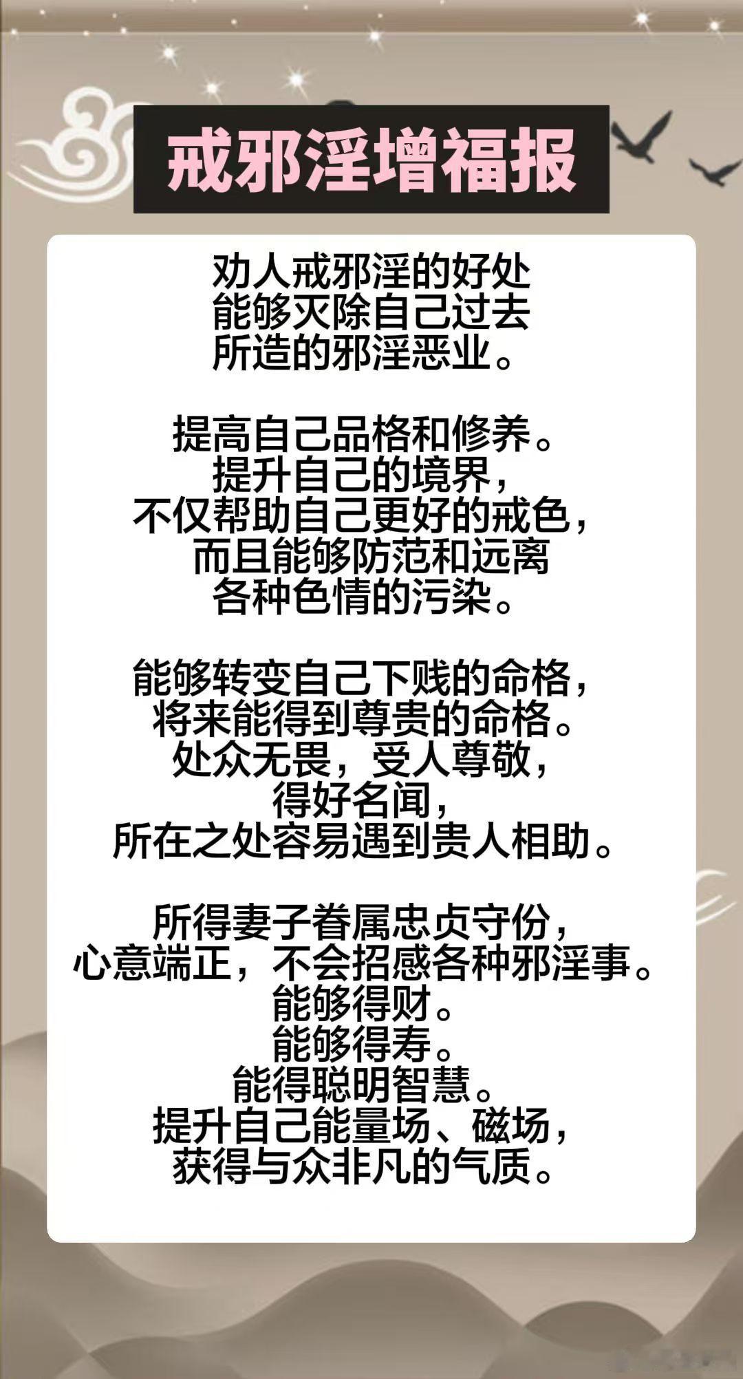 戒除邪淫邪念,最直接的作用就是改运。只要你坚持戒除邪淫,并发愿不再重蹈覆辙,从当下起,命运便开始转变。原本可能遭遇的车祸,如今只会导致跌倒轻伤,血光之灾就此化解;原本可能患上的严重疾病,需要动手术治疗,如今仅为小病;原本考不上的证,现在有望拿下,原本挣不到的财富,现在也有机会获取。戒除邪行邪念,能让身心能量充足,周身正气盎然,让人变得阳光健康,自信自强。你将由内而外坚信,自己能收获成功,顺遂平安。愿天下所有人,都能成功戒除邪淫!
