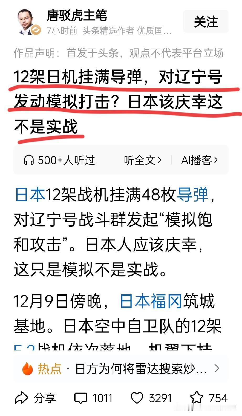 著名国际领域创作者“唐驳虎主笔”写了一篇文章,题目很吸引人:12架日机挂满导弹,对辽宁号发动模拟打击?日本该庆幸这不是实战。 文章透彻地分析了日本的飞机和导弹对我辽宁舰无论怎么攻击,都不会造成任何损失。说日本这样做是一场毫无实战意义的政治表演。 但我看完后却不是这个感受,只是觉得后背发凉,毛骨悚然!一个战败国,竟然公然模拟打击战胜国的航母,这不是战争行为是什么? 如果这位博主说的是真的,我们应该提出严正抗议而且要有具体措施。比如公开对日本本土模拟攻击,然后把结果公之以众。 日本以偷袭闻名于世,偷袭珍珠港,同一天竟然还敢偷袭马来亚!日本还是一个敢于赌的国家,“日俄战争”它都敢打,美国那么厉害,它也敢偷袭。 日本这个国家,不能小觑!料敌从宽,我们不能轻视敌人。一定要有充足的准备,敌人胆敢来犯,一定要让它死无葬身之地!
