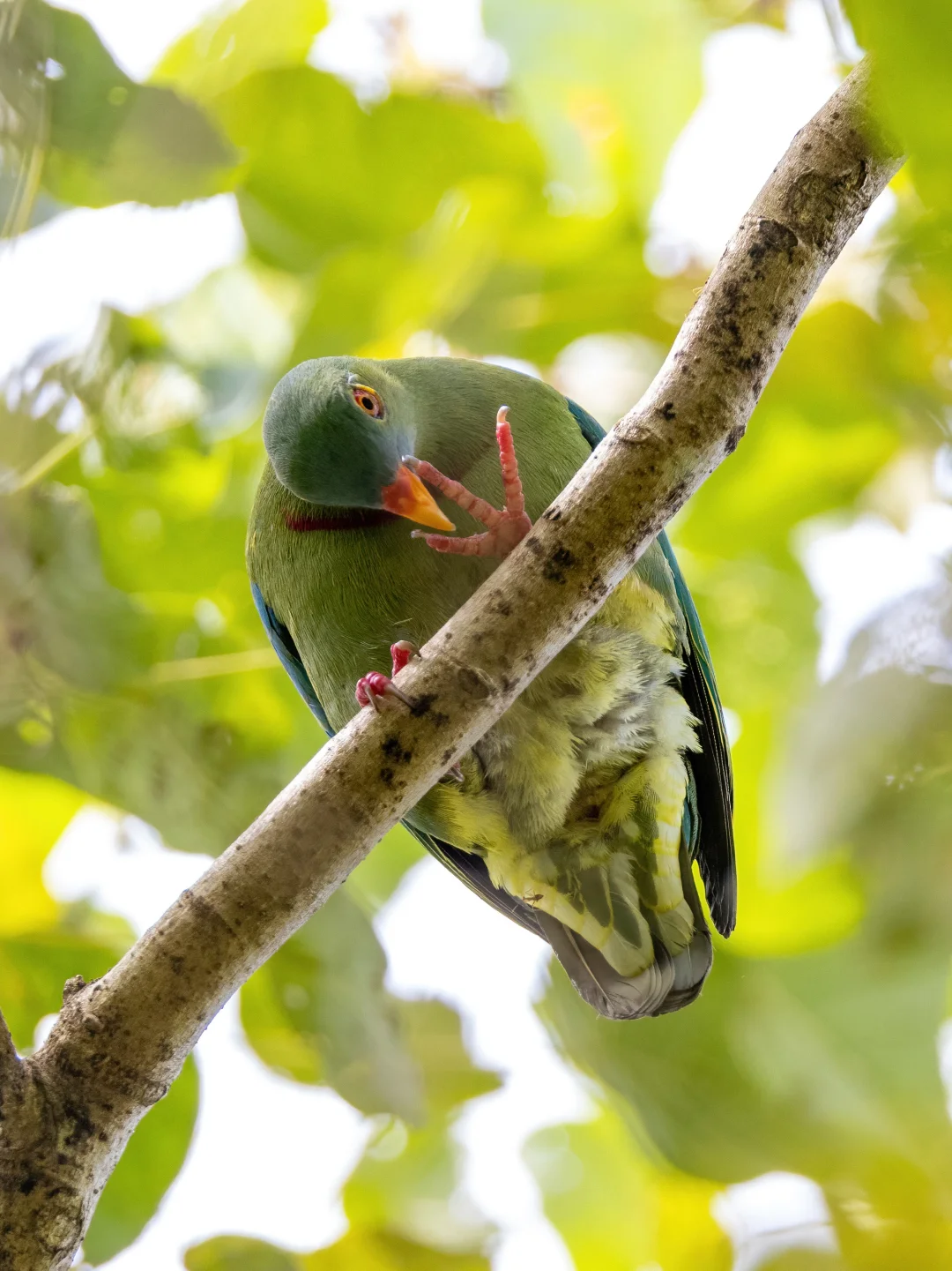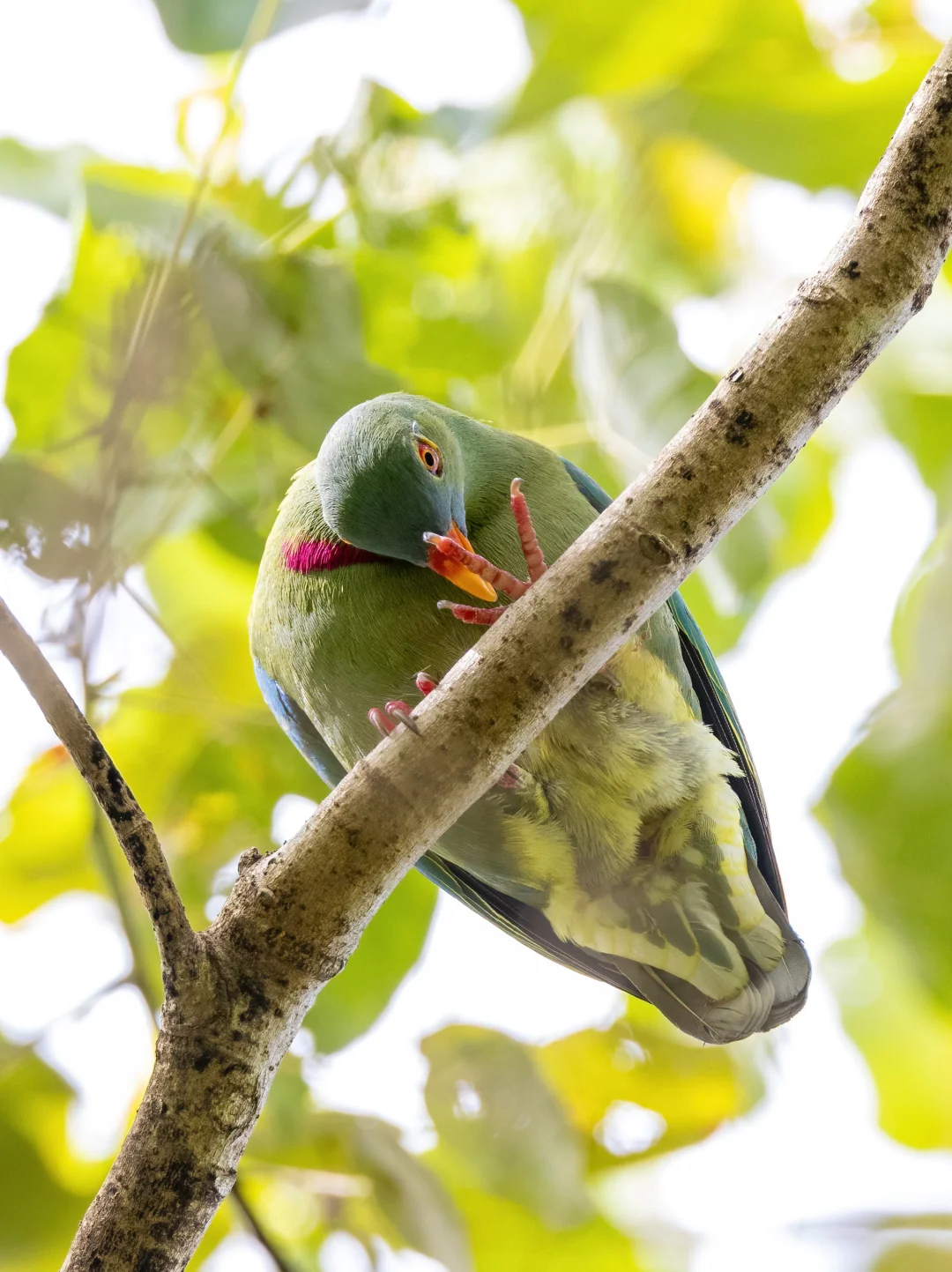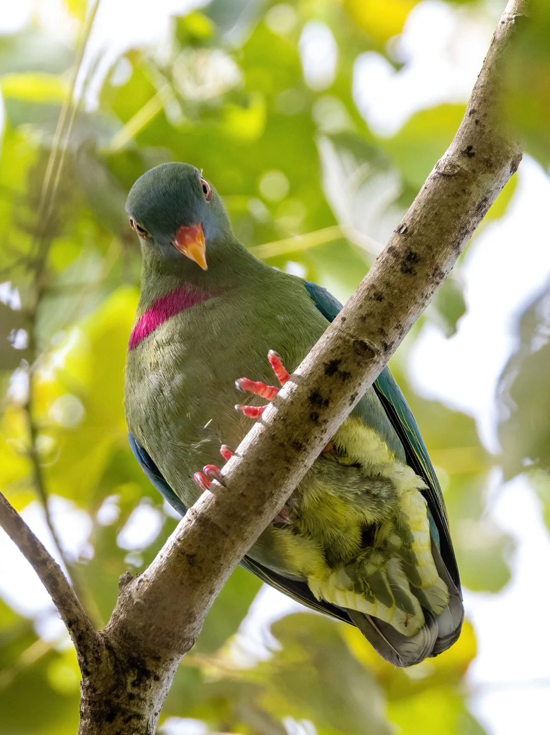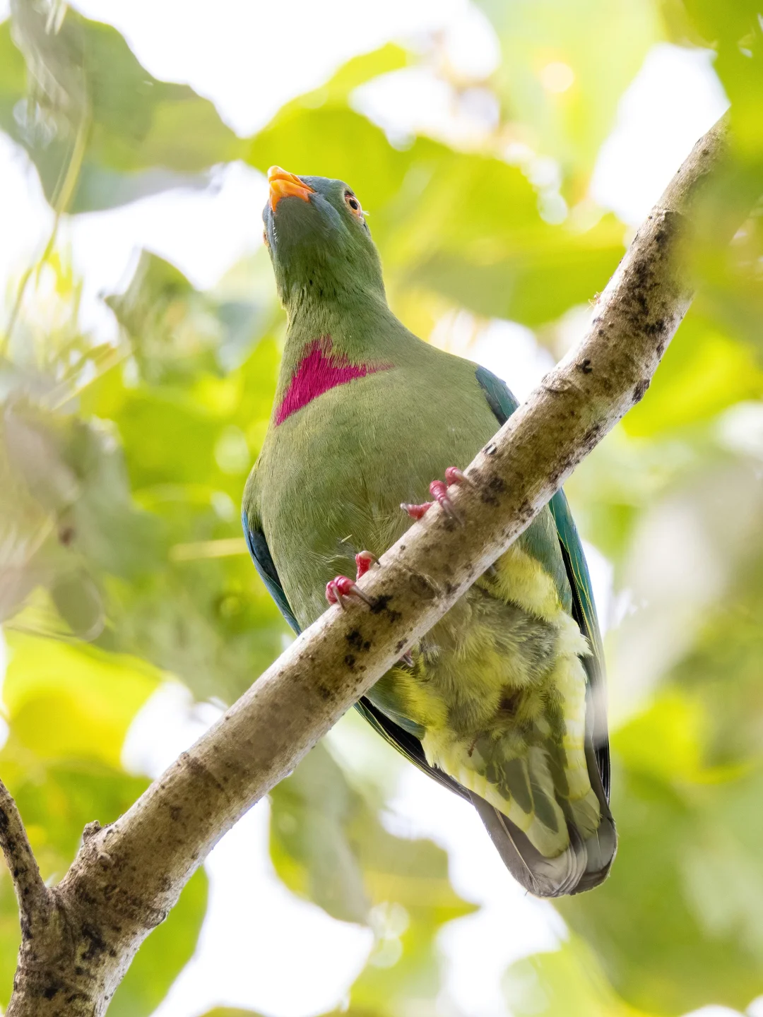 原创拍摄 紫红胸果鸠,鸽形目鸠鸽科果鸠属。 紫红胸果鸠是一种分布在摩鹿加群岛,所罗门群岛,新几内亚岛的小型绿色果鸠,它们最显著独特的特征就是暗紫红色胸部斑块,像是胸前的一朵玫瑰🌹。 这只紫红胸果鸠在我发现他的时候本来在一个很远的山头,没想到在我转身走开之后飞到我面前的大树上。就是大树枝叶太浓密,找了半天才找到一个仰头的角度看到了。