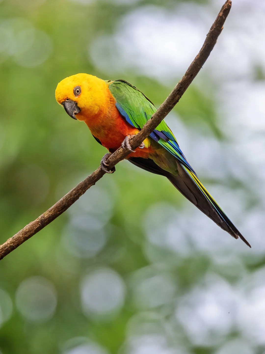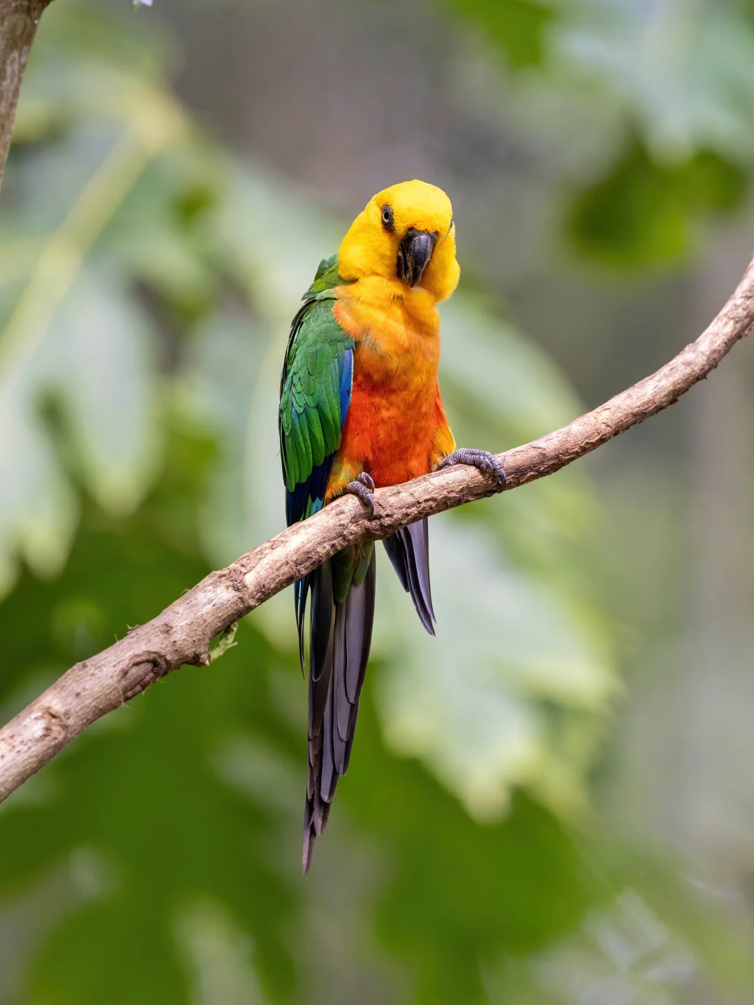 原创拍摄 绿翅金鹦哥,鹦形目鹦鹉科锥尾鹦哥属。 绿翅金鹦哥色彩非常明亮鲜艳,以黄色头部、橙色脸颊和黑色喙为显著特征。另外背部和翅膀是绿色,尖端带深蓝色,翼下覆羽橙红色,臀部和尾上覆羽暗绿金色,尾羽末端蓝色。总之色彩缤纷。 他们生活在巴西东北部的林缘。