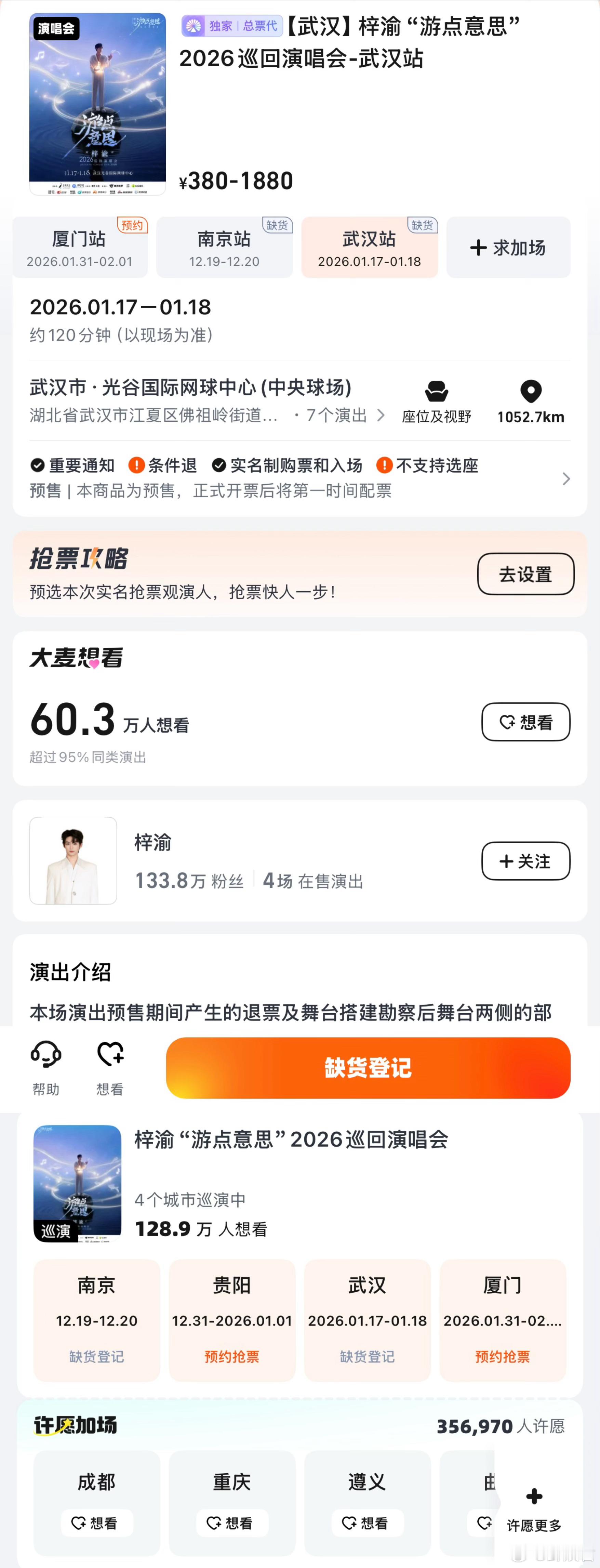 梓渝武汉演唱会又是开票秒罄,抢不到根本抢不到啊!已经有快36万人许愿加场了!梓渝全肯定啊,太棒了!瞬间期待值已经拉满,太想看梓渝的演唱会了!梓渝演唱会抢票