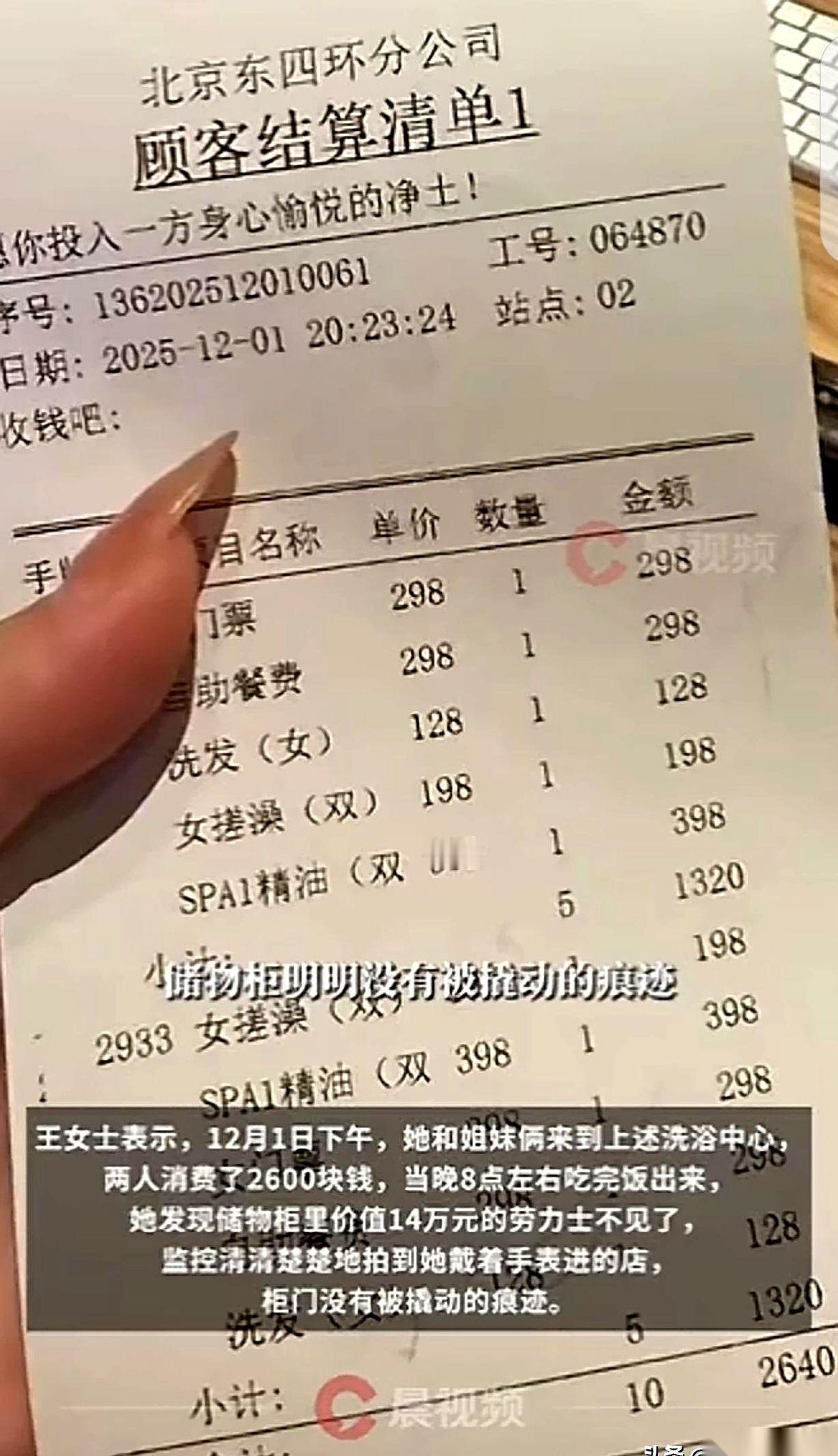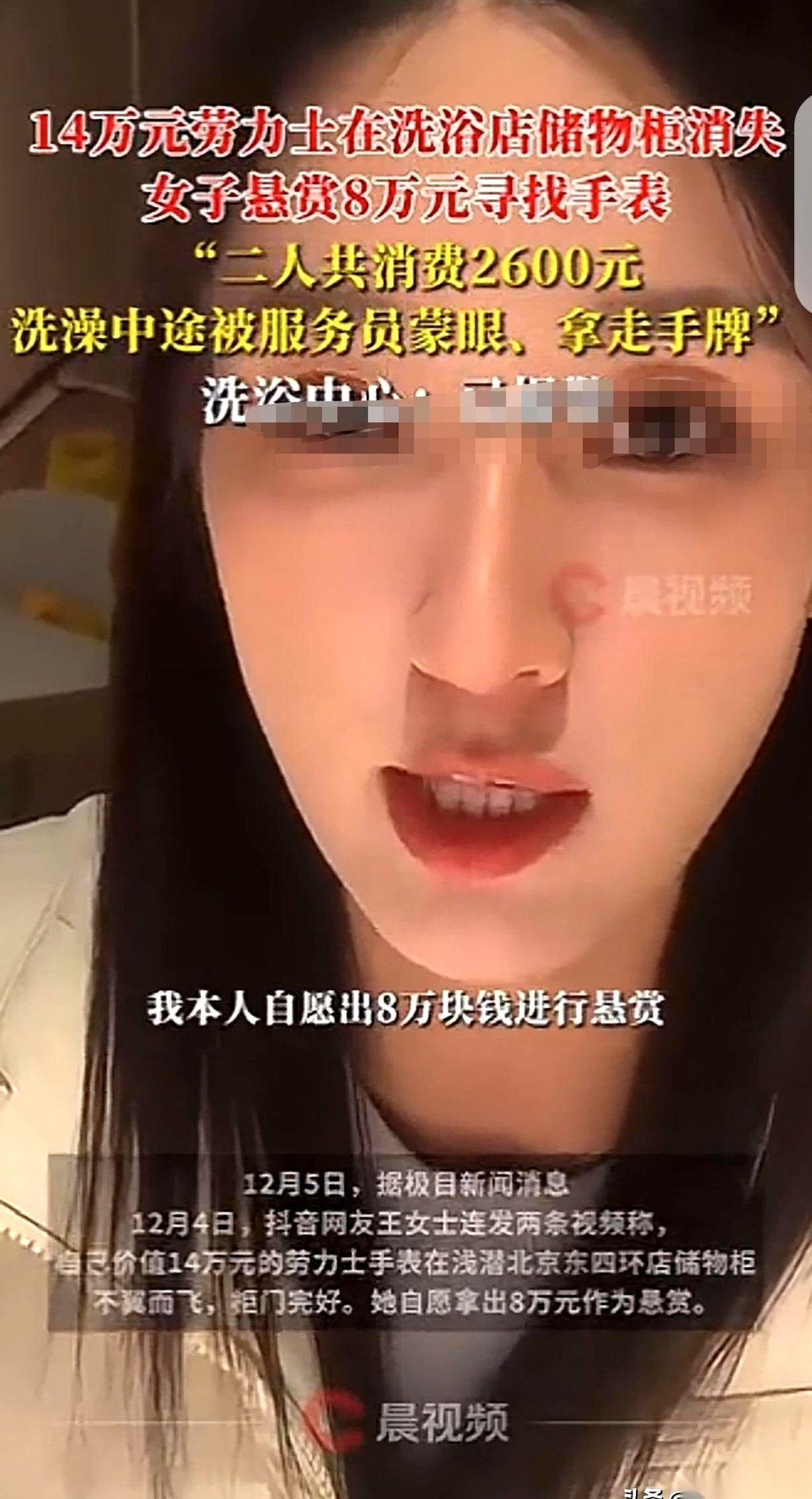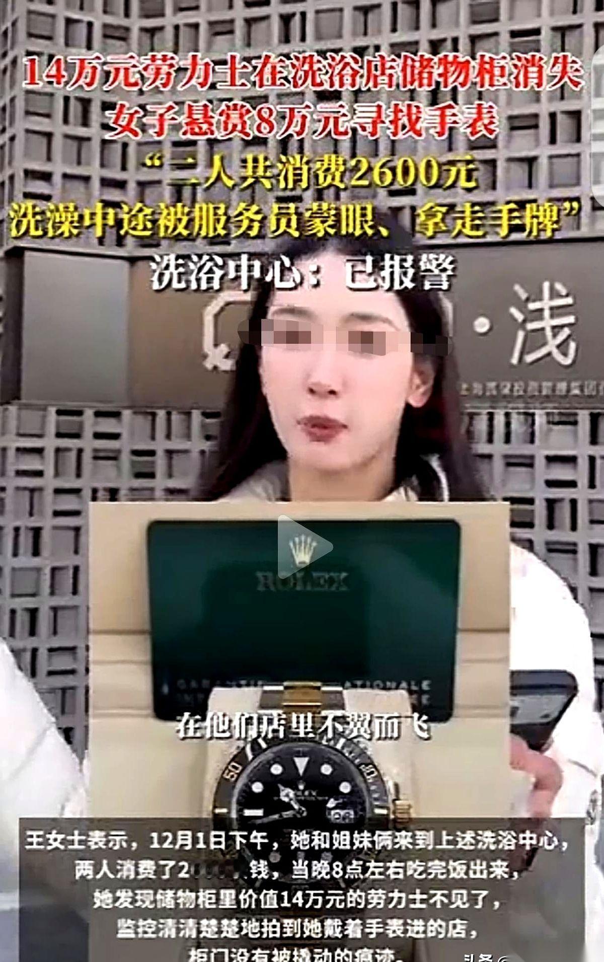 一块热毛巾,盖在你脸上,整个世界就黑了。 你以为是放松,是享受,其实是把自己的命门,大大方方地交了出去。 然后?然后你那块14万的劳力士,就没了。 不是在街边被抢,是在你花了2600块进去的“高端”洗浴中心,从那个你亲手锁好的柜子里,人间蒸发了。 这事儿最讽刺的地方在哪? 柜子,完好无损。 你花大几千,买的不是搓澡,买的是一份“我在这里很安全”的幻觉。你以为铜墙铁壁,其实人家有万能钥匙。 更绝的是店家。 发现丢了东西,你还没缓过神来,人家比你还快,抢先报了警。 这一手,玩得高。把自己摘得干干净净,姿态做得滴水不漏,剩下你一个人,像个无理取闹的傻子。 监控?盲区。 证据?没有。 一切都那么“专业”,专业到让你脊背发凉。 那个女的,最后悬赏八万。 你真以为她是为了找回那块表吗?不。 她是想用钱,砸开一个真相,砸开一个“他们”内部心照不宣的口子。她是在用最后的力气,维护自己被践踏的尊严。 有句评论说得最狠:打开你的柜子,根本不需要你的手牌。 所以你看,最让人心凉的,从来不是丢了东西。 而是你发现,你花钱买来的那份体面和安全感,从头到尾,就是个笑话。