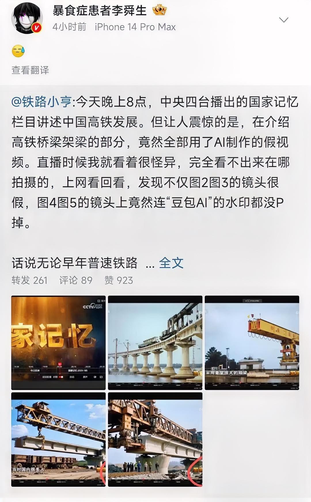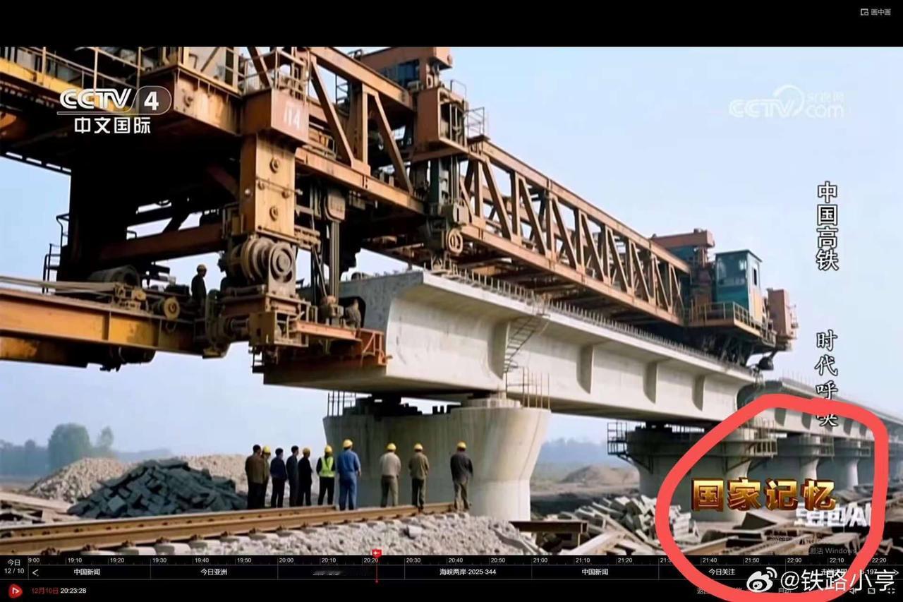 AI已经深入我们生活中的方方面面,央视四套就很好的诠释了这一点。 比如在12月10日,央视四套《国家记忆》栏目《中国高铁发展史》节目中,在介绍高铁桥梁架梁施工环节时,就全程使用AI生成的视频。更牛的是,多处画面仍清晰可见“豆包AI”水印,丝毫不怕让你看见,或者说他们认为视频真假不重要,叙事内容才是重中之重。至于你会怎么想?无所谓。反正这个片子不属于新闻范畴,传达的理念只要不犯错误就行。 内容来自某位热心博主,本人是不看央视节目的,所以无法验证也不想去验证。谁有兴趣可以自行验证。本号发布的内容只专注于国际事件,发布这条内容纯属意外,几天后删除。抱歉占用大家的宝贵时间,来看这条无聊的内容。
