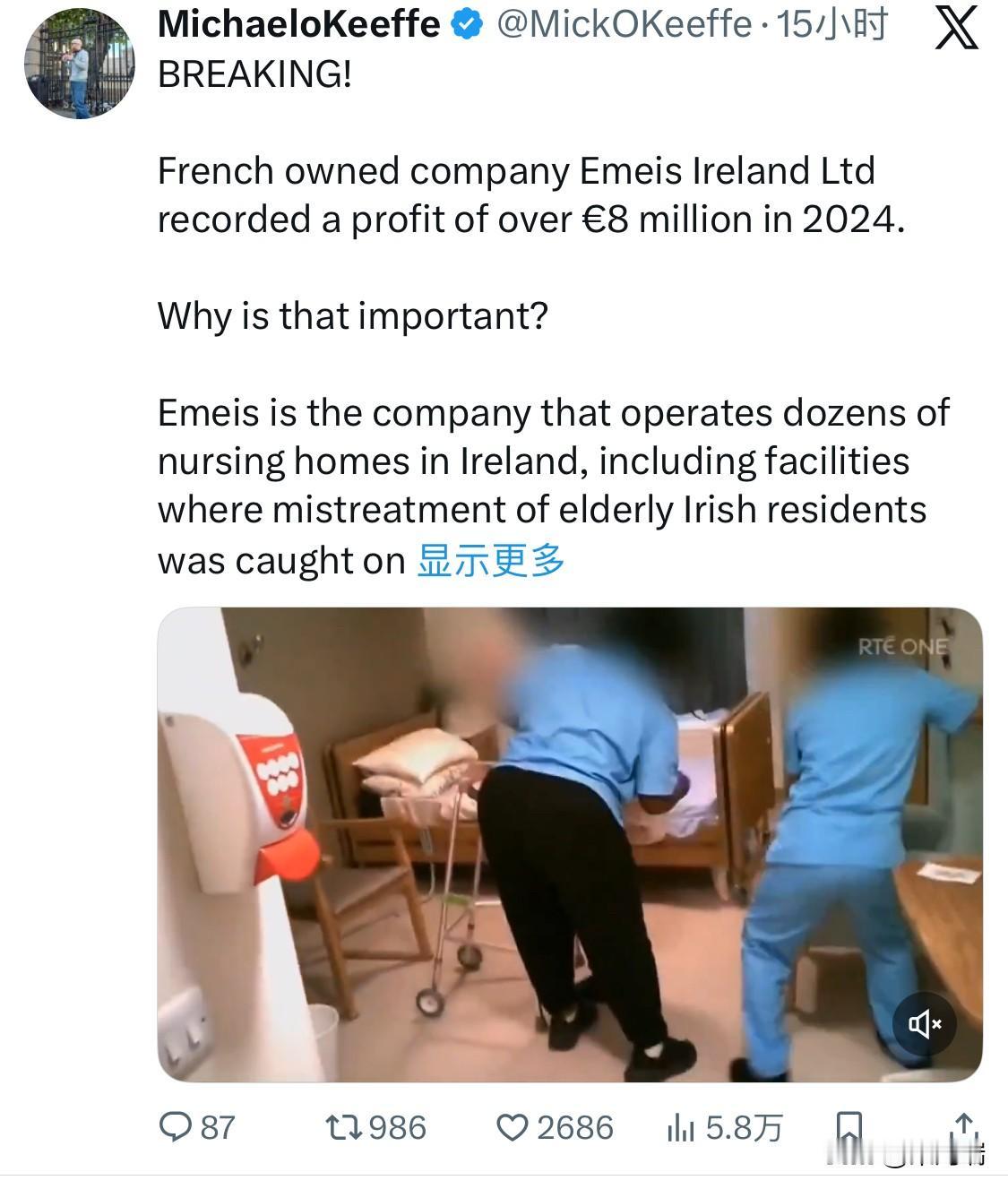 爱尔兰国家广播公司 (RTÉ) 最近播出的一期深度调查节目曝光了 Emeis Ireland 运营的两家养老院中存在虐待和忽视居民的情况,其中包括秘密拍摄的令人痛心的画面。Emeis Ireland(前身为 Orpea)是爱尔兰最大的私人养老院供应商,在全国经营着 27 家养老院。 调查细节: RTÉ 的调查节目播放了卧底研究人员秘密拍摄的画面,记录了都柏林和波特劳伊斯(Portlaoise)的两家养老院(Beneavin Manor 和 The Residence Portlaoise)内护理不善的情况。 影像显示,老年居民(其中一些患有痴呆症)遭到粗暴对待,被强行按入椅子,长时间无人照顾。 居民们请求上厕所时被忽视,有些人长时间穿着弄脏的失禁用品,导致衣物被浸湿。 卧底工作人员还报告了长期人手短缺和基本用品(如失禁垫、消毒湿巾和手套)短缺的问题。 后续影响: 这些令人震惊的画面播出后,在爱尔兰引起了公愤。 爱尔兰卫生部立即下令卫生信息和质量管理局 (HIQA) 对 Emeis 运营的所有 27 家养老院进行全面审查。 HIQA 的初步报告显示,在 Beneavin Manor 养老院,过去三年中接到了近 200 起关于虐待居民的指控。HIQA 已将这些担忧告知爱尔兰警方 (An Garda Síochána),并要求 Emeis Ireland 停止在其所有养老院接收新居民。 Emeis Ireland 对此“毫无保留地”道歉,承认服务标准和维护居民尊严方面存在失误,并表示已启动深入审查以解决所有问题。