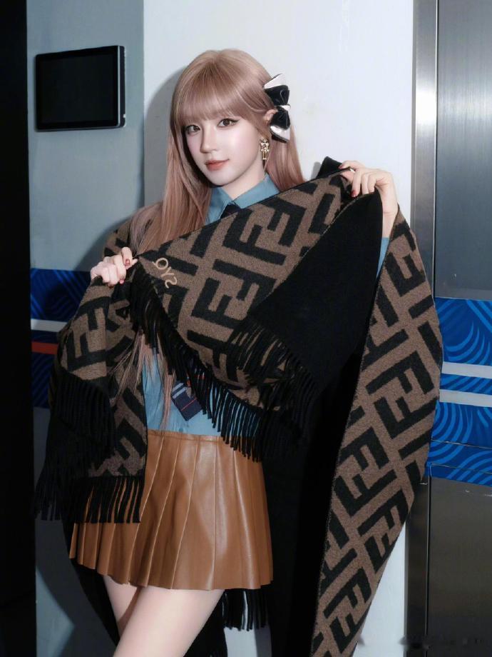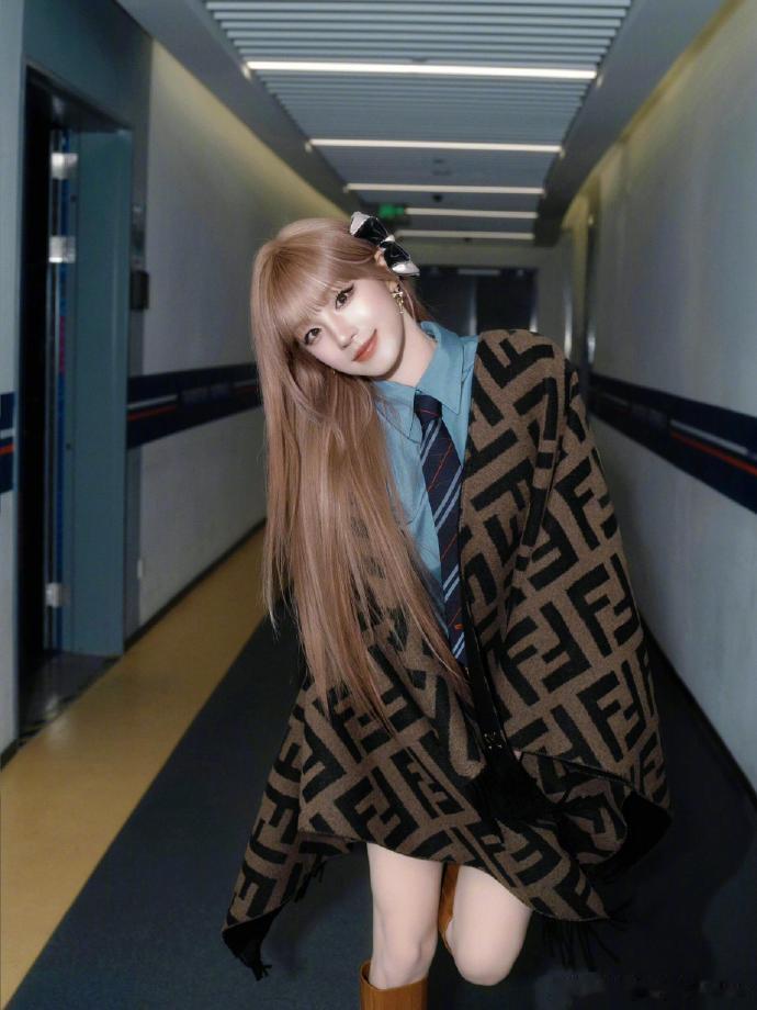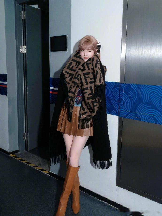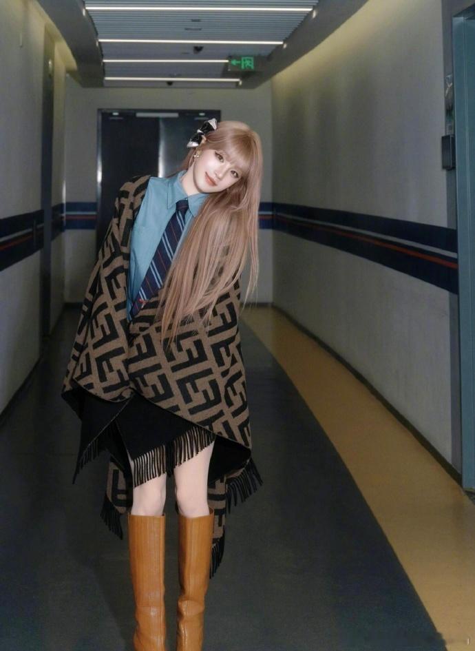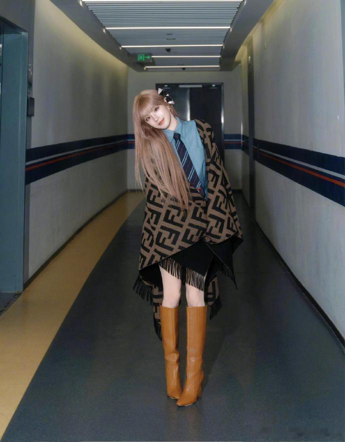 内搭蓝色衬衫与条纹领带,搭配棕色长靴与蝴蝶结发饰。浅色头发好亮眼,英伦时尚感十足,留学归来的大小姐娱乐娱乐