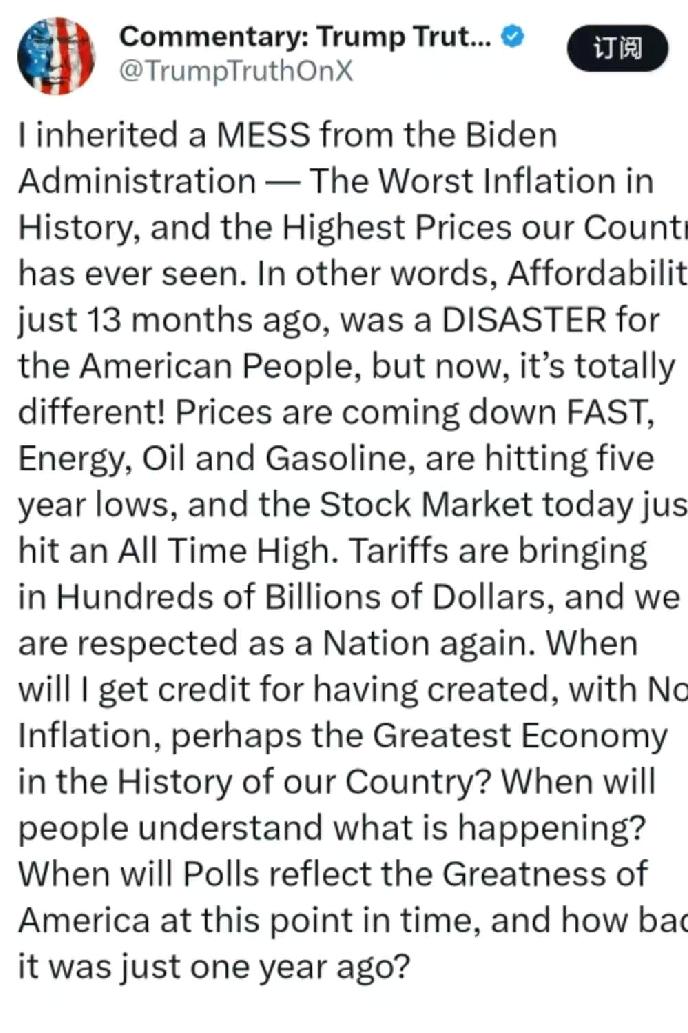 12月12日,特朗普发文写道:“接手拜登留下的高通胀、高物价烂摊子后,我仅用13个月便实现显著改观,当前物价快速下降,能源、石油及汽油价格跌至五年低点,当日美国股市也创下历史新高,关税更带来数千亿美元收入,美国重拾国际尊重,在众多质疑声中我打造了美国史上最伟大的经济体,且无通胀,但我不明白为何我未获得赞誉,而民调又未反映当下美国的辉煌,谁能告诉我这是为什么?” [机智]特朗普的辉煌迷思——自夸式经济童话太上头!特朗普这波自卖自夸堪称年度喜剧名场面,一边喊着无通胀,一边靠关税薅羊毛充财政,殊不知这数千亿关税本质是向美国消费者变相征税,1.34万亿美元的财政赤字还在那儿站岗呢,油价五年低点、股市新高的辉煌,难掩关税推高企业成本的隐忧,所谓最伟大经济体,不过是把财富转移包装成经济奇迹,民调不买账?答案很简单:民众要的是口袋里的真实获得感,不是嘴炮里的虚假繁荣,毕竟,没人会为羊毛出在羊身上的成就喝彩,也没人能忽略被掩盖的经济隐疾——这场自导自演的辉煌大戏,终究骗不过现实的卸妆水!