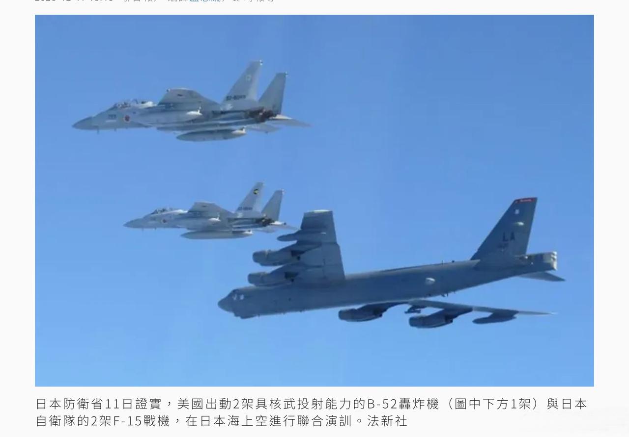 美国展示军力,B-52轰炸机出动,与日本一起联合演习! 根据日本防卫省公布的内容,美国2架具有核武投射能力的B-52战略轰炸机,12月10日与日本的F-35隐形战机、F-15制空战机在日本海进行了联合军演。防卫省确认日本自卫队与美军的备战态势。 防卫省表示,美日在此次行动中”重申坚决反对任何单方面以武力改变现状的企图“。