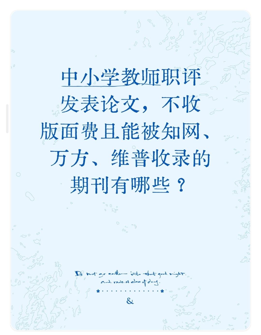 中小学教师职评发表论文,不收版面费且能被知网、万方、维普收录的期刊有哪些? 对于中小学教师职评,以下简要列举部分符合要求的期刊(请务必投稿前核实最新要求): 1. 《教学与管理》(小学版、中学版、理论版) · 知网收录,部分栏目不收费。 2. 《中小学管理》 · 知网收录,注重实践研究,优质稿件可能免版面费。 3. 《基础教育课程》 · 知网收录,教育部课程教材研究所主办,不收版面费。 4. 《中小学教师培训》 · 知网收录,东北师范大学主办,对稿件质量要求较高,可能免收费用。 5. 《现代中小学教育》 · 知网收录,东北师范大学主办,部分稿件可免费。 6. 《教育研究与评论》(江苏教育出版社) · 知网收录,部分方向免收费用。 7. 地方教育期刊 · 如《XX教育》(省级教育厅或教科院主办,如《上海教育》《福建教育》等),部分不收费,但通常对作者单位或稿件要求较高。 注意事项: · 以上期刊多数以 质量为先,免费通常针对优质稿件或特定栏目。 · 建议通过官方渠道投稿,谨防冒充网站。 · 投稿前可查询期刊官网的“投稿须知”或电话咨询收费政策。 · 职评时需确认期刊是否被本单位认可的数据库收录(有些单位仅认定期刊网收录,不认可“电子出版”等渠道)。 建议优先选择 本单位职称评定文件明确认可的期刊,并尽早准备,因为审稿周期可能较长。