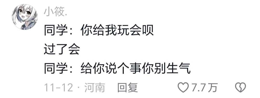 同学:你给我玩会呗 过了会 同学:给你说个事你别生气