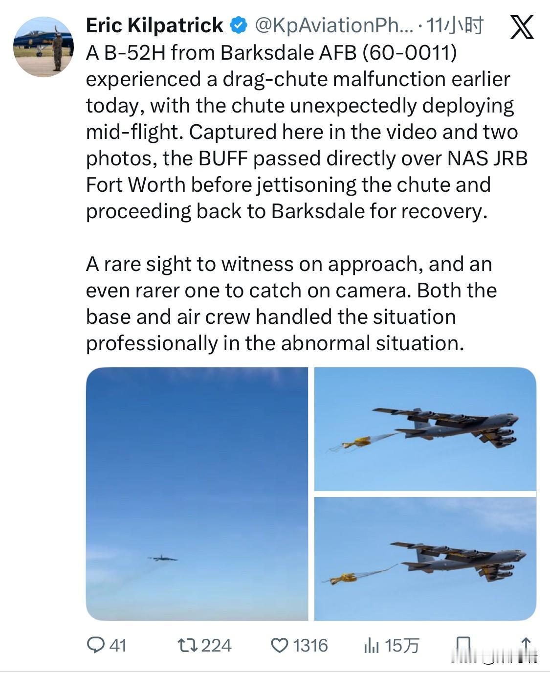 今天早些时候,一架隶属于巴克斯代尔空军基地的B-52H轰炸机(编号60-0011)的减速伞发生故障,降落伞在飞行途中意外打开。从视频和两张照片中可以看到,这架“水牛”(BUFF)轰炸机在抛弃减速伞并返回巴克斯代尔基地回收之前,直接飞越了沃斯堡海军航空站联合后备基地。 在进场过程中看到这样的景象实属罕见,而用相机捕捉到这一幕更是难得一见。基地和机组人员在这种特殊情况下都表现得非常专业。 巴克斯代尔空军基地 (Barksdale Air Force Base) 位于美国路易斯安那州博西尔城 (Bossier City) 以东约1.5公里处,隶属于美国空战司令部 (ACC),是美国空军的重要战略基地。