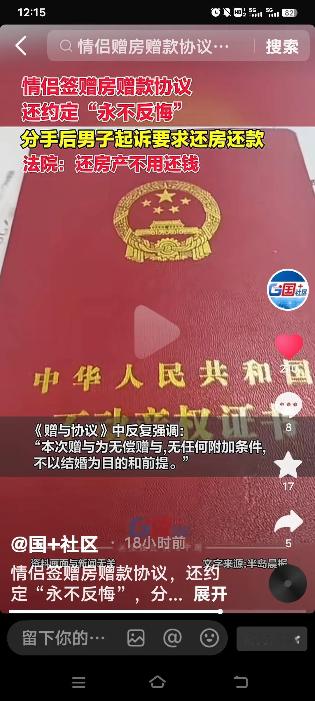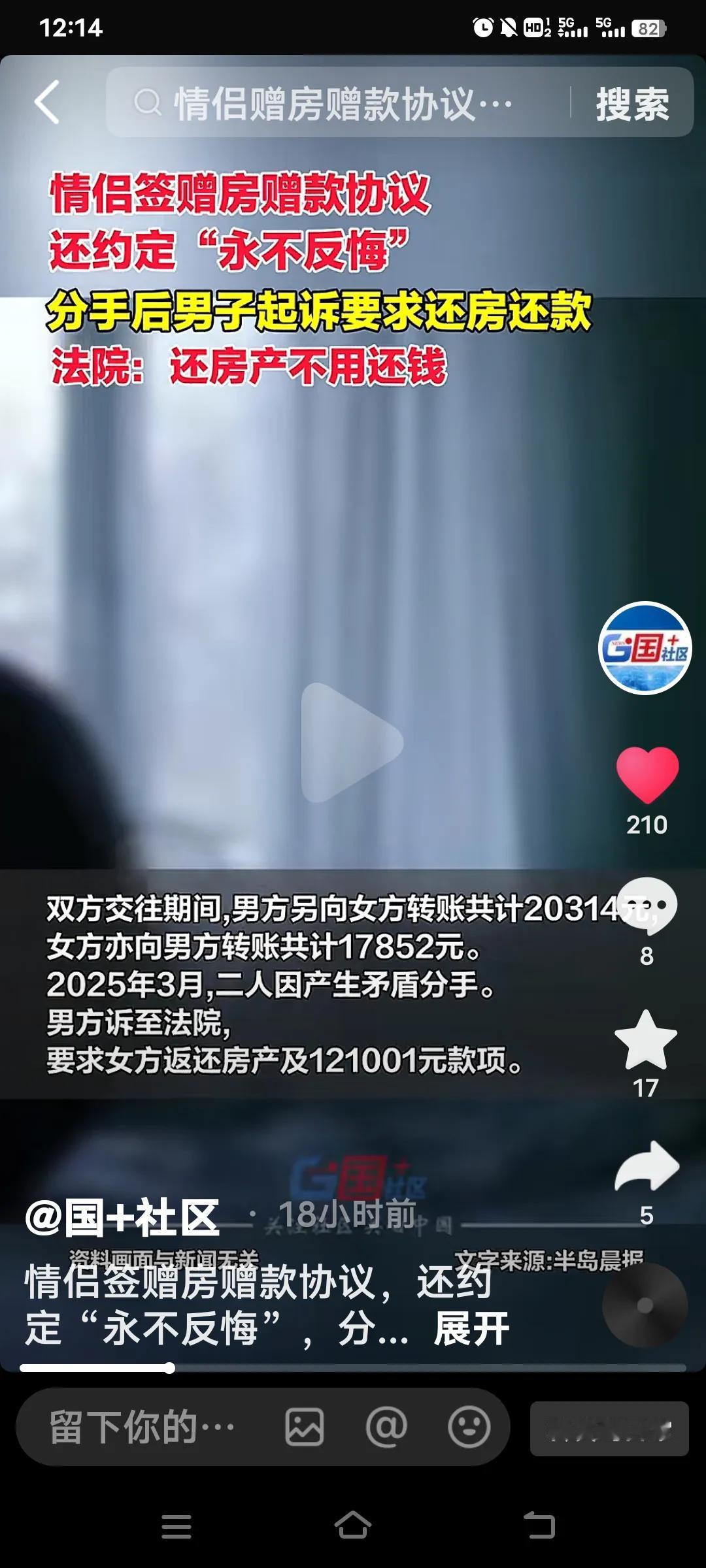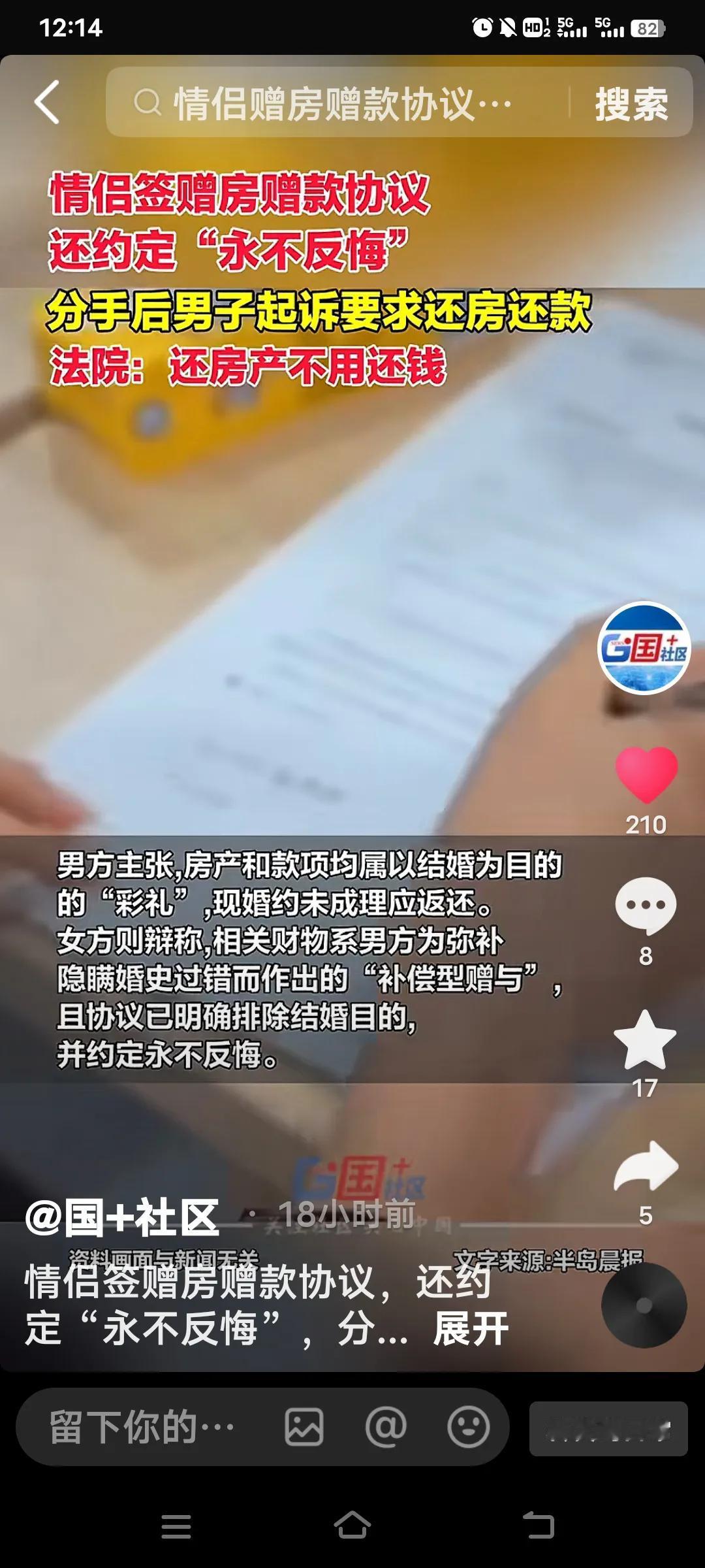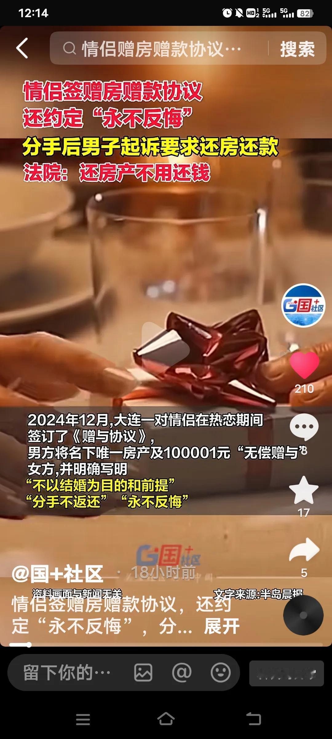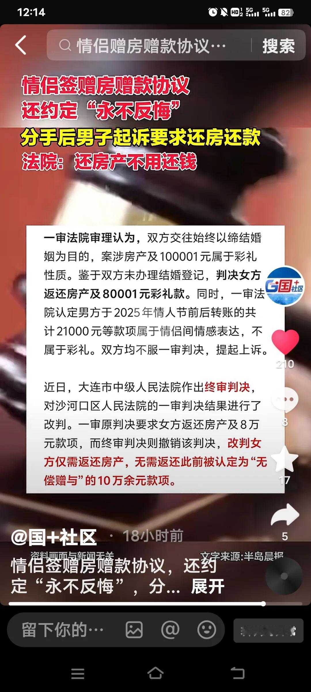 大连这对情侣的赠房协议纠纷着实引人关注。2024年12月,处于热恋期的男女双方迅速签订了《赠与协议》,男方将自己唯一的房产以及10001元赠予女方。协议中还明确写道“不以结婚为前提”,即便分手也“永不反悔”。 然而到了2025年3月,两人因矛盾而分手,男方随即向法院提起诉讼,试图要回赠予的财物。 在交往期间,男方另外向女方转账共计20314元,女方也向男方转账共计17852元。男方想要回12001元。女方则认为,这些财物是对男方隐瞒婚史过错的“补偿型赠与”,况且男方在协议中写明了“永不反悔”。 一审时,法院判决女方返还80001元和房子。但二审出现反转,女方只需返还房子,此前认定的无偿赠与10万余元无需返还。 这起案件给我们提了个醒,恋爱期间赠送大额财物需谨慎。虽然书面约定很重要,但像房产这类特殊资产,还会受到公平原则的约束。 年轻人在签订恋爱赠礼协议时,可不能头脑一热就随意落笔。虽说十万、八万说起来轻松,可挣钱的艰辛又有谁不清楚呢! 赠与合同 房产赠予协议 房产赠与陷阱 婚前购房协议