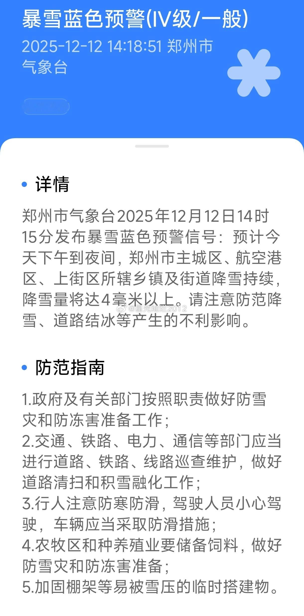 暴雪蓝色预警(IV级/一般)2025-12-12 14:18:51郑州市气象台首次发布详情郑州市气象台2025年12月12日14时15分发布暴雪蓝色预警信号:预计今天下午到夜间,郑州市主城区、航空港区、上街区所辖乡镇及街道降雪持续,降雪量将达4毫米以上。请注意防范降雪、道路结冰等产生的不利影响。防范指南1.政府及有关部门按照职责做好防雪灾和防冻害准备工作;2.交通、铁路、电力、通信等部门应当进行道路、铁路、线路巡查维护,做好道路清扫和积雪融化工作;3.行人注意防寒防滑,驾驶人员小心驾驶,车辆应当采取防滑措施;4.农牧区和种养殖业要储备饲料,做好防雪灾和防冻害准备;5.加固棚架等易被雪压的临时搭建物。