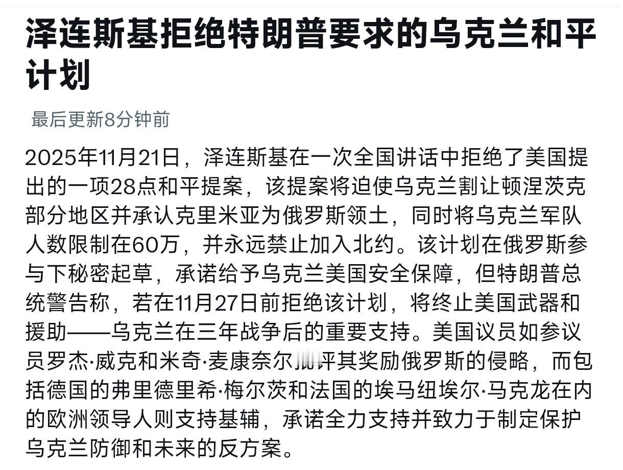 特朗普的计划真的能够为欧洲带来真正的和平吗? 以下是主要提案: 结束战争。 俄罗斯将保留克里米亚和顿巴斯。 北约将不再扩张。 乌克兰不会加入北约,但可以加入欧盟。 对俄罗斯的制裁将逐步解除。 但冻结的俄罗斯资产将有1000亿美元用于重建乌克兰。 俄罗斯将加入八国集团。 乌克兰将限制军队人数为60万。 乌克兰没有外国军队协议达成后100天内乌克兰选举。 乌克兰将禁止所有纳粹意识形态。 这是乌克兰唯一的解决方式。遗憾的是泽连斯基拒绝了这一提议,乌克兰自愿成为美国的地缘政治棋子,并为之付出了巨大代价。