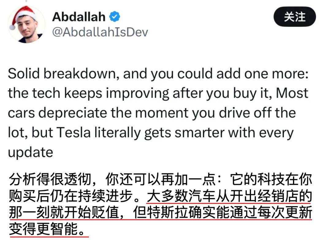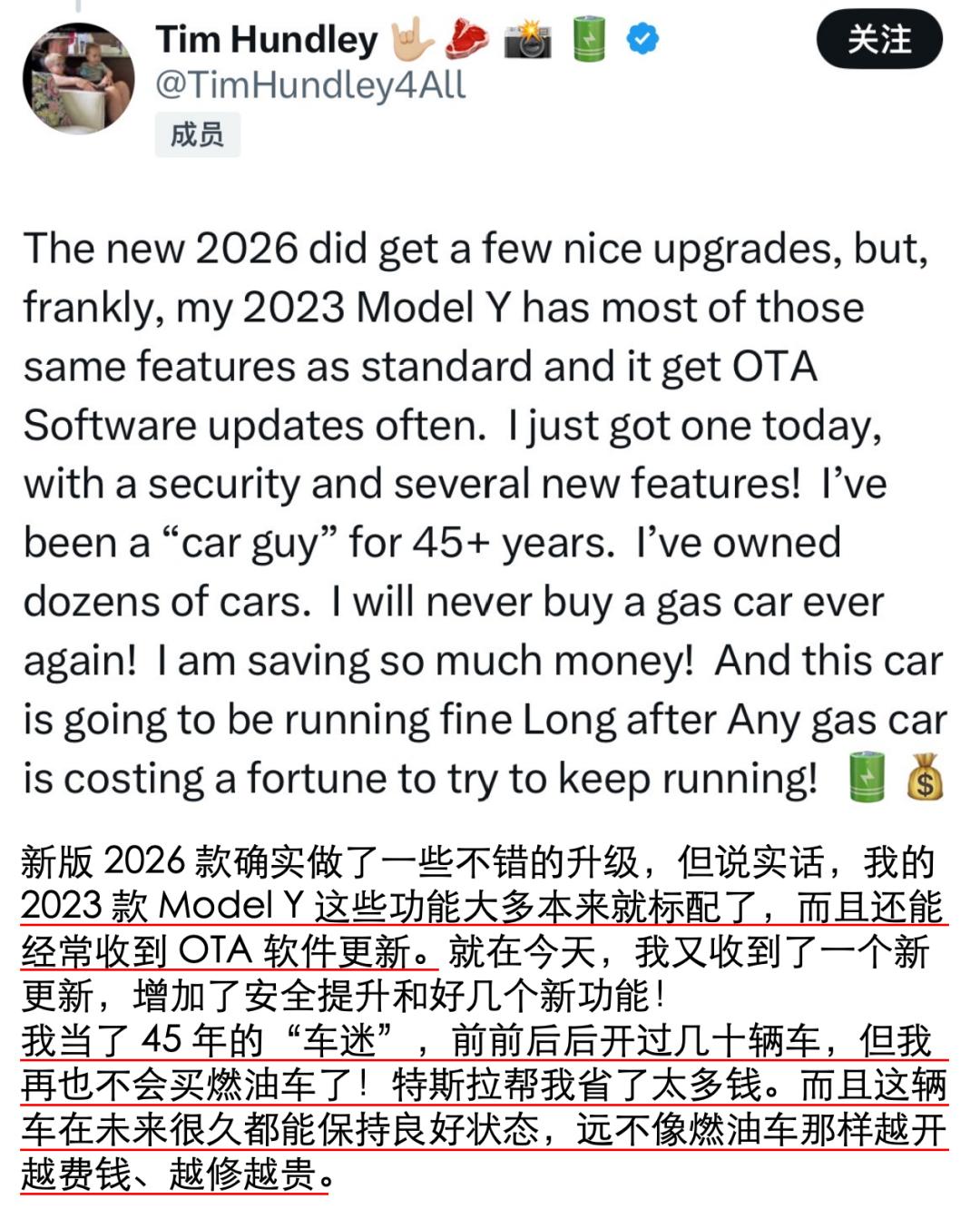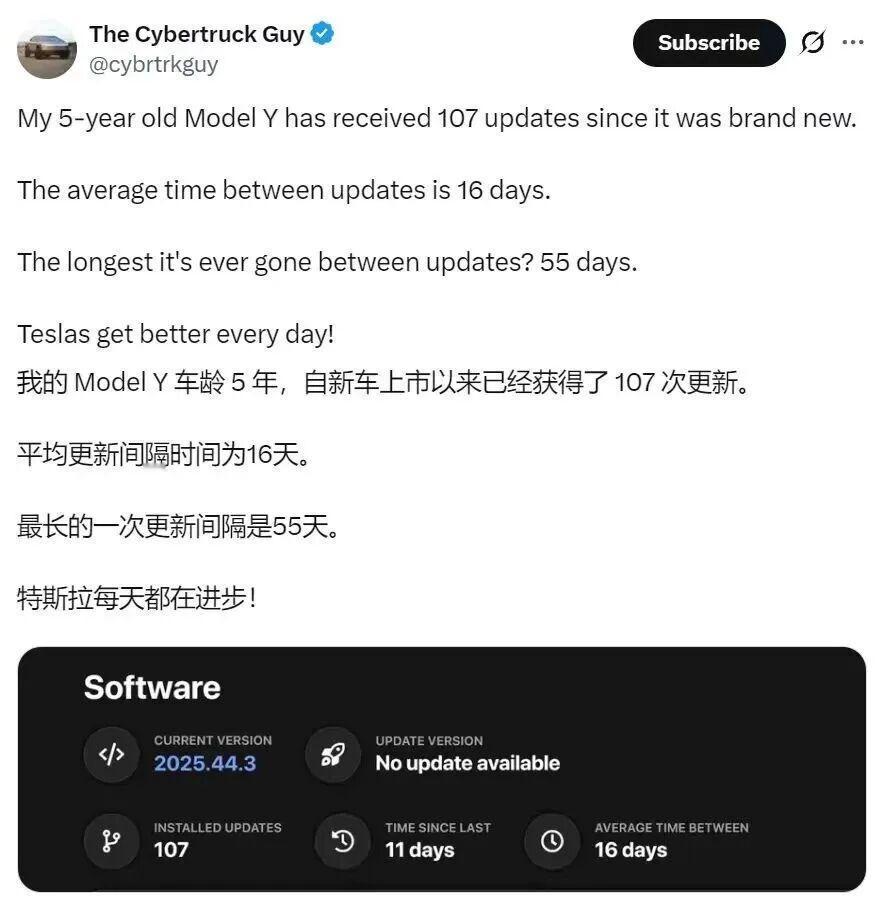 有海外车主分享了Model Y 5年升级记录:累计OTA 107次,相当于每16天进化一次。他的总结很精辟:“感觉车每天都在变好。” 对于我们普通车主而言,这意味着什么? --- 核心就三点: 1️⃣ 安全持续进化:紧急制动、障碍物识别的算法不断优化,让你的被动安全“常用常新”。 2️⃣ 体验不断增值:免费获得如“赛道模式”等价值堪比万元选装包的功能,几年下来相当于省下一大笔。 3️⃣ 保值更有底气:车况透明、体验不过时,这或是Model 3等车型三年保值率持续领先的关键原因之一。 --- 传统燃油车的价值在出厂时达到顶点,而智能电车的价值,则始于交付。【来自懂车帝车友圈】