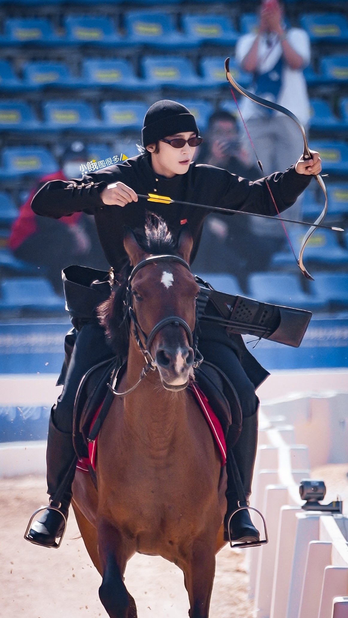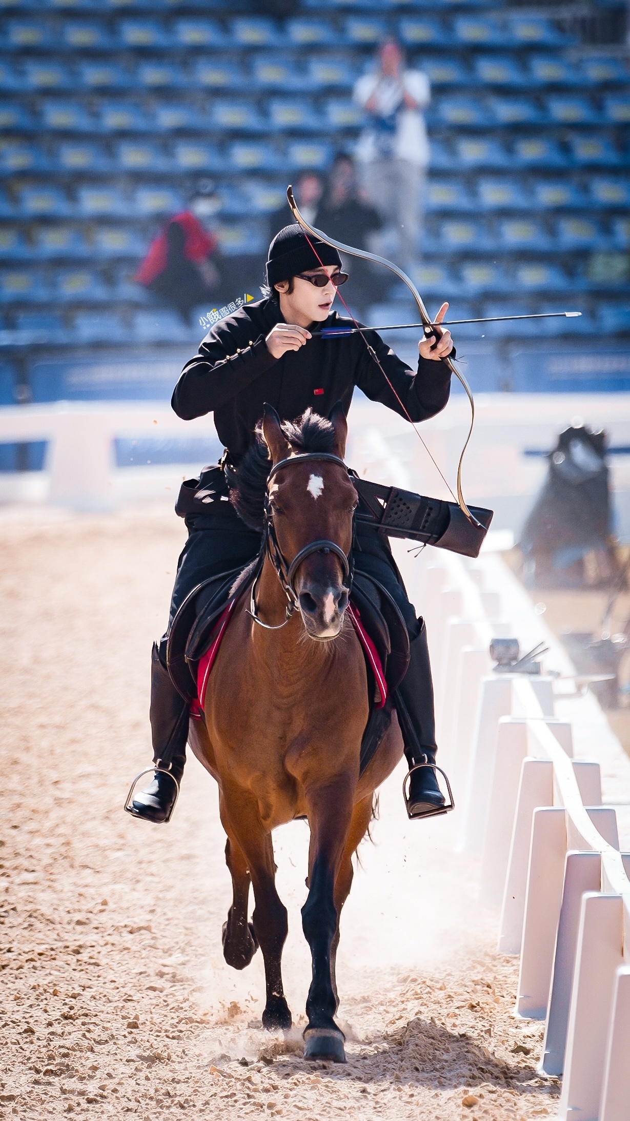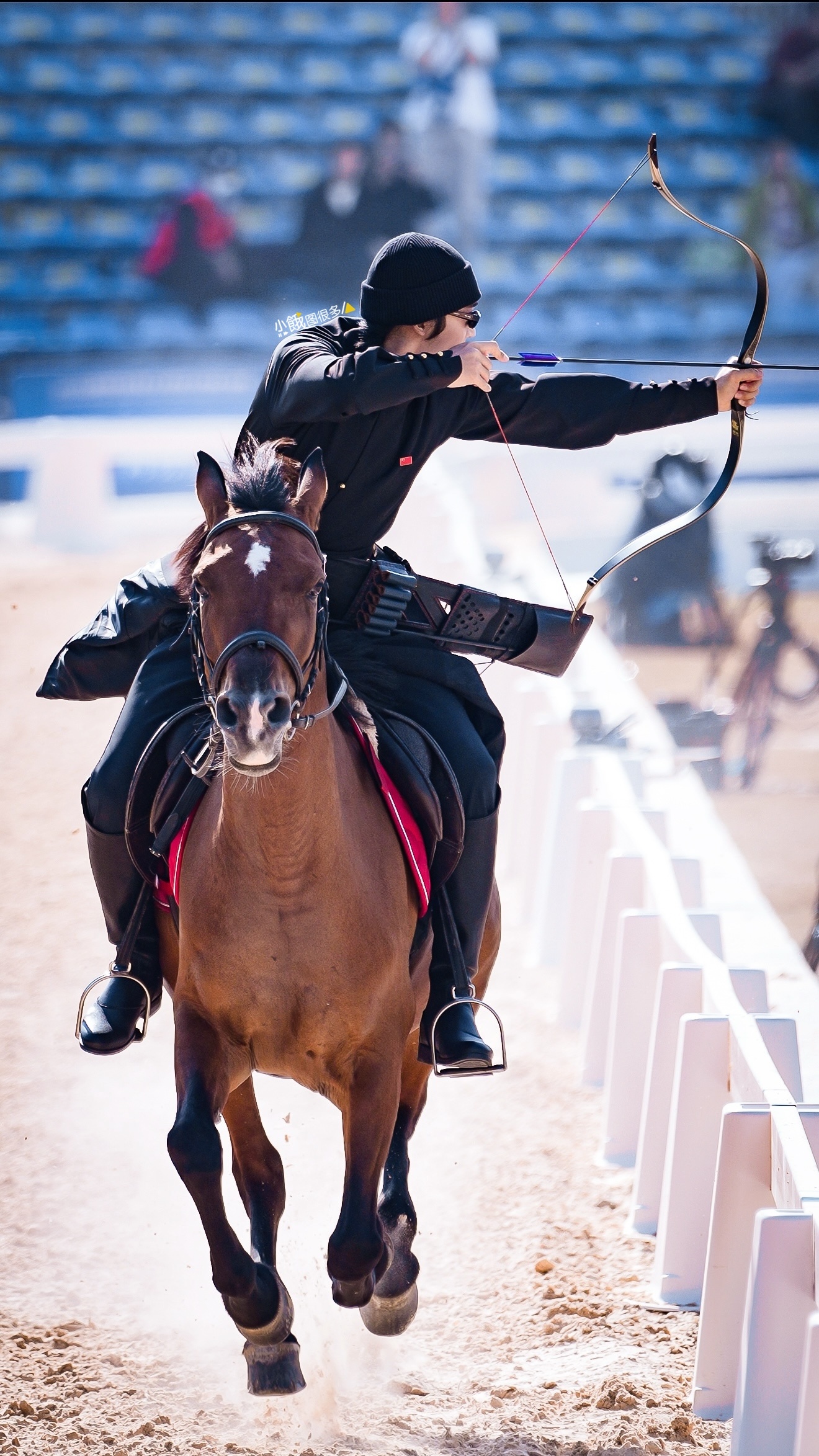 于适骑射比赛 20251212 于适亮相2025全国骑射巡回赛总决赛光启式团体赛公开组资格赛比赛高清图集6p,黑衣骏马紫金箭尾,于主任加油 于适参加环球骑射大师赛