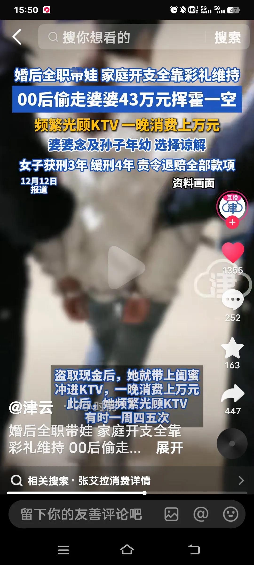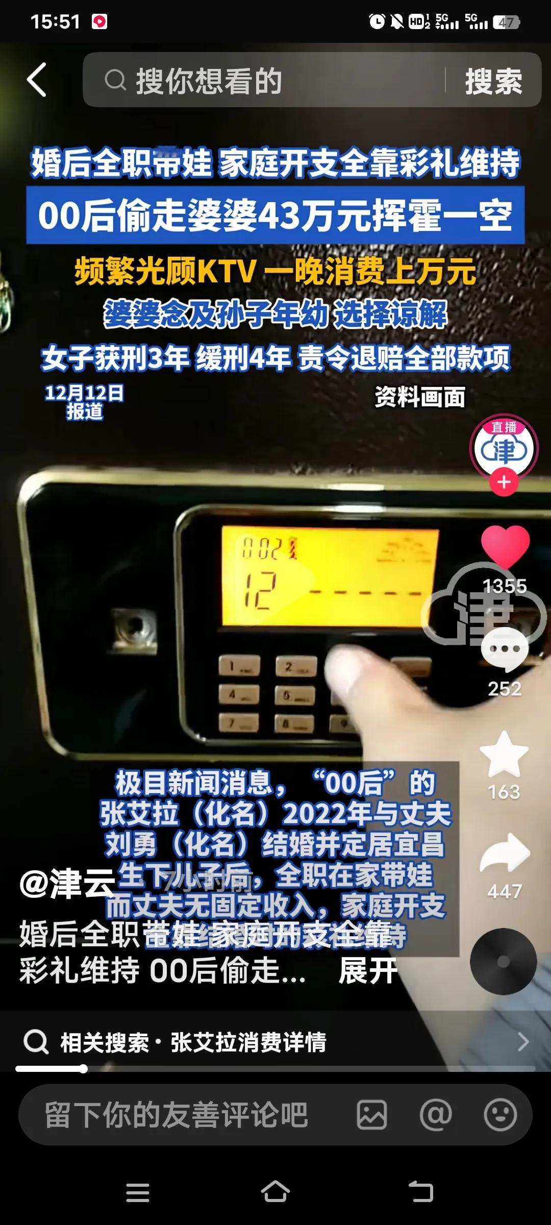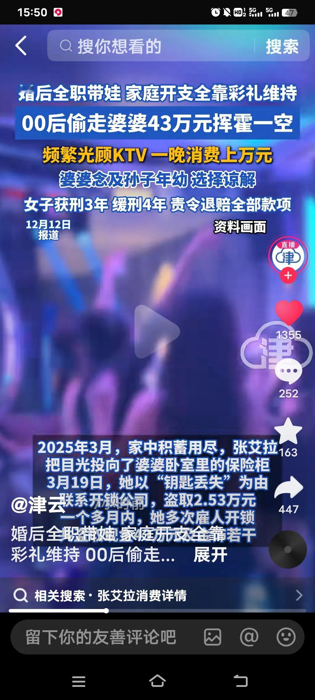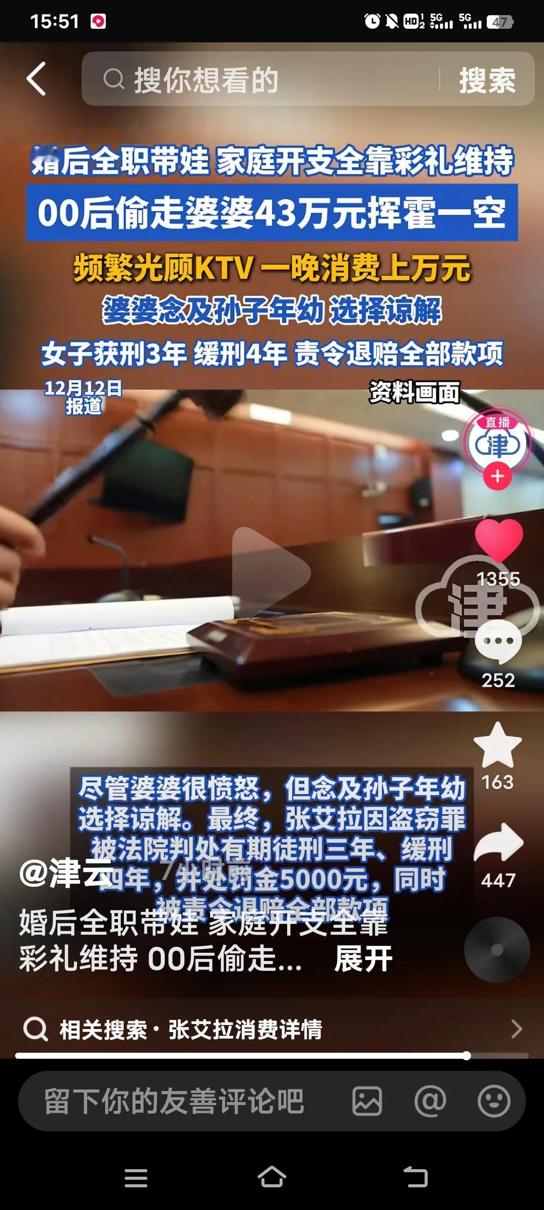 00后儿媳张艾拉偷走婆婆43万,此事着实令人唏嘘不已。2022年,她与丈夫刘勇(化名)结婚生子后便全职在家带娃,丈夫没有固定收入,家庭开支全依赖彩礼支撑。 2025年3月,积蓄耗尽,她竟打起偷婆婆保险柜钱的想法。短短40多天,她成为了KTV的“至尊黑卡会员”,有时一周要去四五次,还会带上闺蜜,一晚上的消费就高达上万。又带着孩子住宾馆游玩,仅仅一个多月,43万元便被她挥霍一空。 5月4日,婆婆发现保险柜被盗,无奈之下只能报警。毕竟,这已然构成犯罪。最终,她被判处有期徒刑三年、缓刑四年,罚款5000元,同时被责令还需退赔全部款项。 婆婆再气愤念及孙子,又在亲家的苦苦求情下,才选择谅解她。但即便如此,她还是要承担法律责任。她如此行事,莫不是被生活的压力逼得昏了头,实在是糊涂啊!那些钱没有用在该用的地方,全打了水漂,为何不存起来呢? 通过这件事,也给家庭相处敲响了警钟。家庭成员之间多些理解与支持,才不至于把人逼上极端之路。正所谓“清官难断家务事”啊! 偷花婆婆 张艾柠 预言婆婆