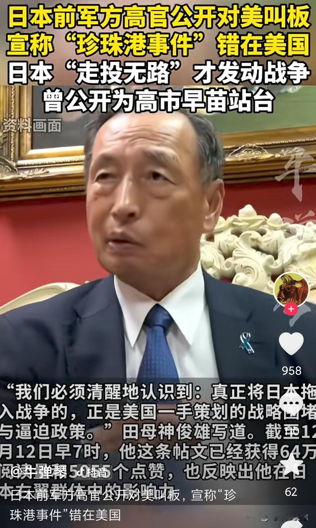 在美国纪念珍珠港事件 84 周年之际,日本军官认为:美国错在先,日本被逼向美国开战! 日本这个航空自卫队的前参谋长的言论,够高市忙擦屁股的了。 日本作为法西斯主义国家及国军主义国家,与德国 意大利 共称为法西斯主义的轴心国,其中主要就是要侵略世界,当然也包括入侵美国。 然则正值美国正在纪念此事件之时,日本航空自卫队前参谋长田母神俊雄美化“偷袭珍珠港历史事件",并对美国表示不满,而同时美化了日本军国主义的邪恶。 珍珠港事件的史料清晰,攻击方是谁、发动武力的是谁,从来没有模糊空间。如今竟有人反过来质问美国,把侵略行为描绘得似乎与日本无关,这种逻辑已经不属于“偏见”,而属于“刻意翻案”。 珍珠港事件是美国人心中不可触碰的记忆,是二战中最具象征意义的事件之一。如今有人把这一事件重新解释为“美国的阴谋”,不但荒谬,也显示出翻案力量已经不再克制。 如今日本的右翼势力正在企图为二战翻案,而日本为了成为正常国家正在刻意的为自身“正名”。而如今拿珍珠港事件说事,日本右翼正在这么做,而作为右翼代表的高市也将为此事件向美国解释说明 忙于擦屁股的活,否则美国人不会放过日本这种言论发酵!