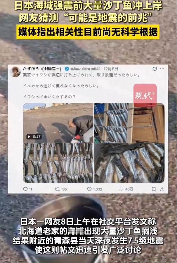 沙丁鱼“预警”?日本海滩异象引地震猜测 8日上午,一位日本网友在社交平台发布的一则动态引发轩然大波。该网友称,自己北海道老家的海滩上出现了大量沙丁鱼被冲上岸的奇特景象,密密麻麻的沙丁鱼铺满海滩,场面颇为壮观。 令人意想不到的是,就在当天深夜,附近的青森县竟发生了7.5级地震。地震发生后,这则原本普通的海滩异象帖文迅速在网络上发酵,引发了大量网友的热烈讨论。 众多网友纷纷猜测沙丁鱼被冲上岸和此次地震之间可能存在某种关联。有人直言:“这可能是地震的前兆吧。”还有网友列举出过往一些地震前动物行为异常的案例,试图佐证这种猜测,认为动物似乎有着人类难以察觉的感知能力,能提前感知到地震即将来临,沙丁鱼大规模被冲上岸或许就是它们发出的“警报”。 然而,也有部分网友保持理性态度。他们指出,虽然动物在地震前出现异常行为的现象时有报道,但目前并没有确凿的科学依据能证明沙丁鱼被冲上岸就一定和地震直接相关。海洋环境的变化、水温的异常、水流的方向改变等多种因素,都可能导致沙丁鱼大规模聚集并被冲上海滩。 目前,日本相关部门尚未对沙丁鱼被冲上岸和此次地震的关联性发表明确看法。科学家们也表示,虽然会关注这一现象,但需要进一步深入研究和分析,收集更多的数据和证据,才能判断这两者之间是否存在科学意义上的联系。这场由海滩异象引发的地震猜测,仍在持续引发着人们的关注和思考。"沙丁鱼预警"