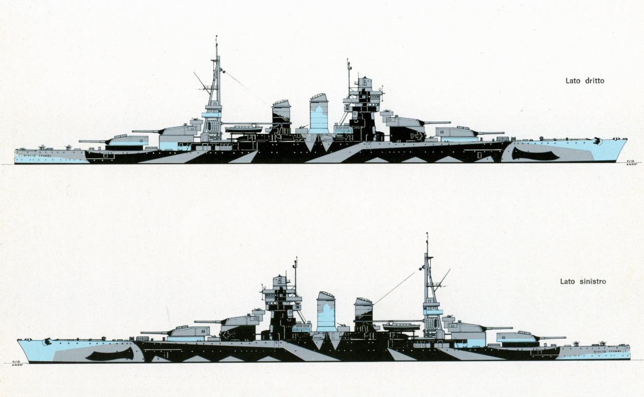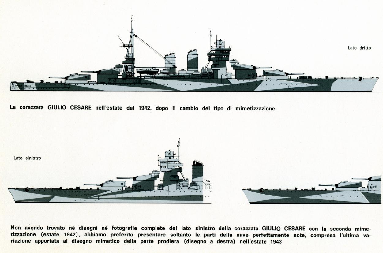朱利奥·凯撒号战列舰的迷彩涂装 图1、图2:1942年1月,根据海军画家克劳迪乌斯的建议,意大利海军朱利奥·凯撒号战列舰(属加富尔伯爵级)所施涂的首版迷彩涂装。 图3、图4:朱利奥·凯撒号战列舰于1942年夏季更换涂装方案后的状态。 不得不说大改后的加富尔伯爵级战列舰的颜值还是可以的。 以下是现代化改装后的加富尔伯爵级的参数: 舰长:186.4米 舰宽:28米 吃水:10.36米 标准排水量:23619吨 满载排水量:29100吨 航速:28节 武备:2座三联装加2座双联装320毫米/43.8倍径主炮;12门120毫米/50倍径副炮;8门100毫米高射炮;16门37毫米高射炮;12门20毫米高射炮。