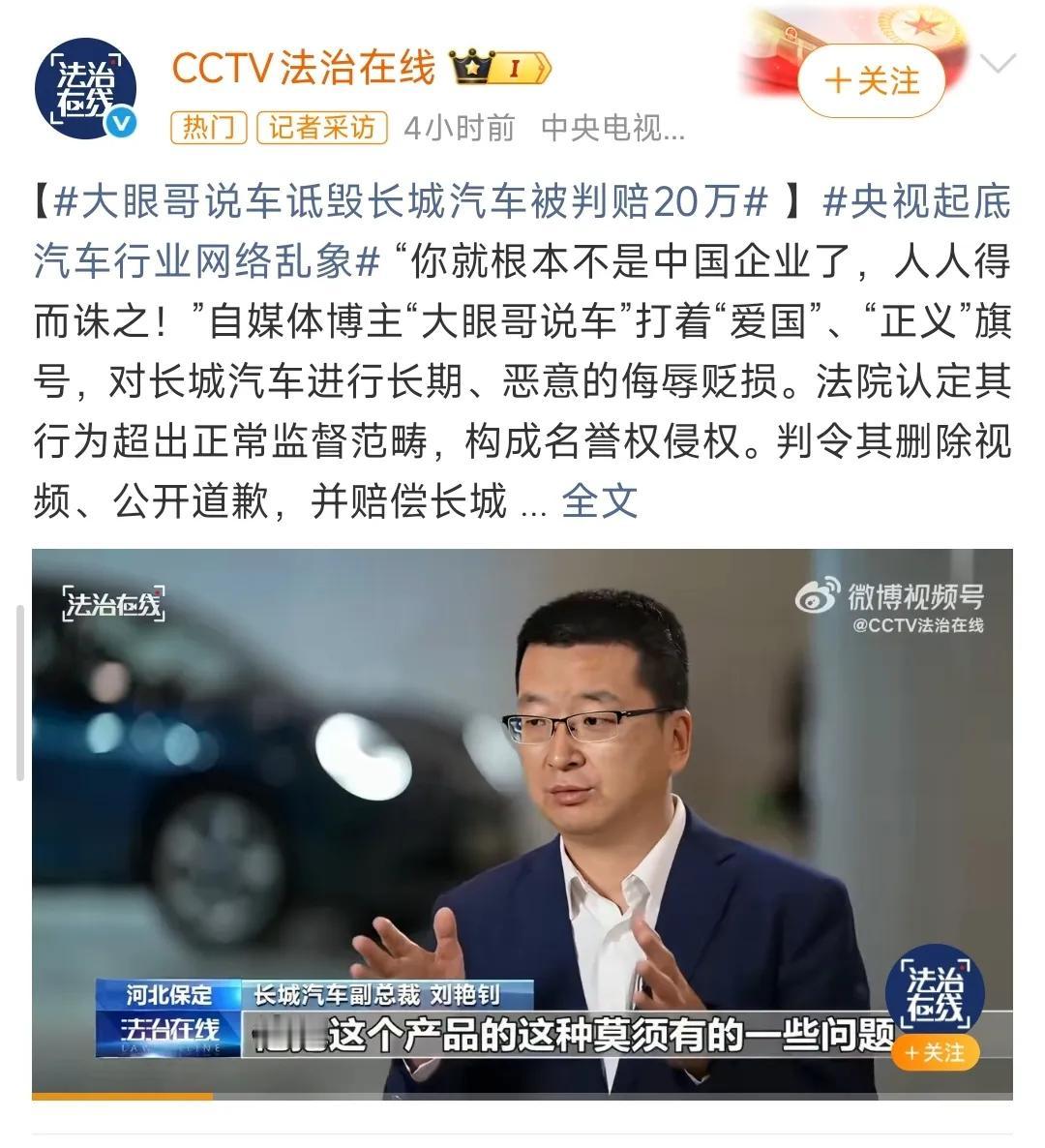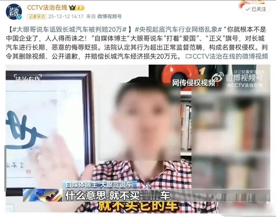 大眼哥算是车评人吗?这人好像很关注长城汽车,长期在多平台发布大量以长城汽车为特定对象的视频,这次被判赔20万,求锤得锤。 大家觉得大眼哥冤枉吗?