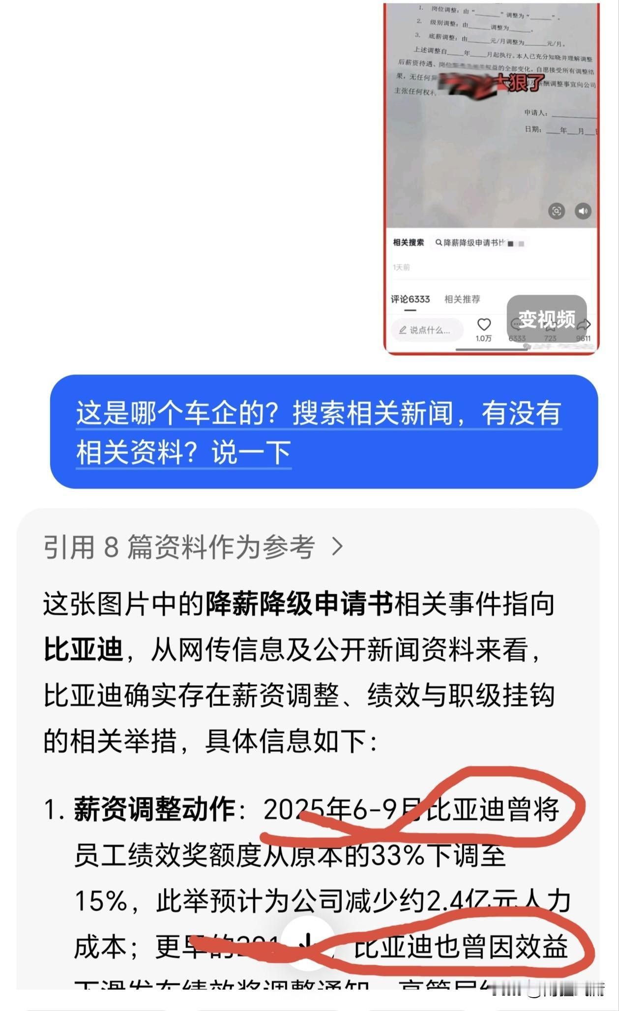 我爱公司,所以我主动申请降薪。 这就是中国车企,我们怎么能不爱他? 你说什么?佳能公司n加一赔款?那是他们脑袋抽风了吧,为什么要赔给员工那么多? 公司给了我一份工作,我应该去感谢公司,公司倒闭了,我应该主动给公司钱才对,挽救大厦于将倾时。 像这个byd公司:因为这个申请降薪我去询问了豆包,这是哪个公司? 豆包告诉我是byd公司: 果然国产公司就是能深得员工的喜爱。 所以他销量这么高,所以说他能赚钱。