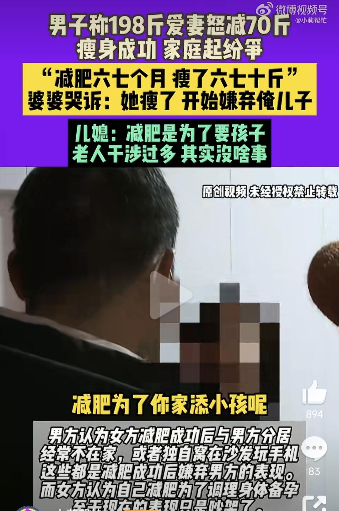 女人:我生孩子是为了你家生的 男人:我挣钱是为了你挣得 婆婆:你好吃懒做啥也不干 河南一女子,结婚前198斤。结婚以后六个月每天跑操,节食。成功减重70斤。现在还有不到130斤了。 瘦下来以后。婆婆开始不乐意了。觉得儿媳妇既不出去挣钱。也不给丈夫做饭。每天就躺着玩手机。生活费和减肥的钱都是她儿子给的。 媳妇在家啥都不干属于享清福了。说儿子两只手磨了老茧。心疼了。 她老公觉得自己挣钱辛苦了。媳妇瘦下来了。会有别的心思。心不在自己身上了。 而媳妇说他们夫妻俩本来没事。就是婆婆搅和的。导致两个人分居。减肥也是为了怀孕。 真的是乱成一锅粥了 生孩子是为了别人 努力工作是为了别人 娶媳妇就是用来当牛做马使唤 传宗接代生娃的 这都什么奇葩的三观呀 生了孩子这样的家庭氛围 对娃成长也是消极的呀 婆家对生娃想法 人为什么要生孩子 婆媳矛盾的深层次原因是什么