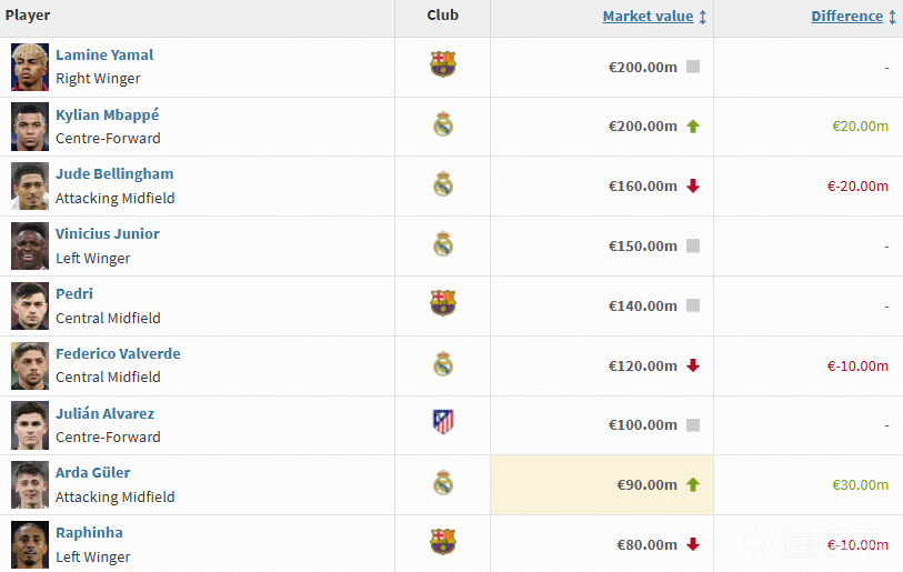 北京时间12月12日,德国转会市场公布了最新一期西甲球员身价。亚马尔、姆巴佩2亿