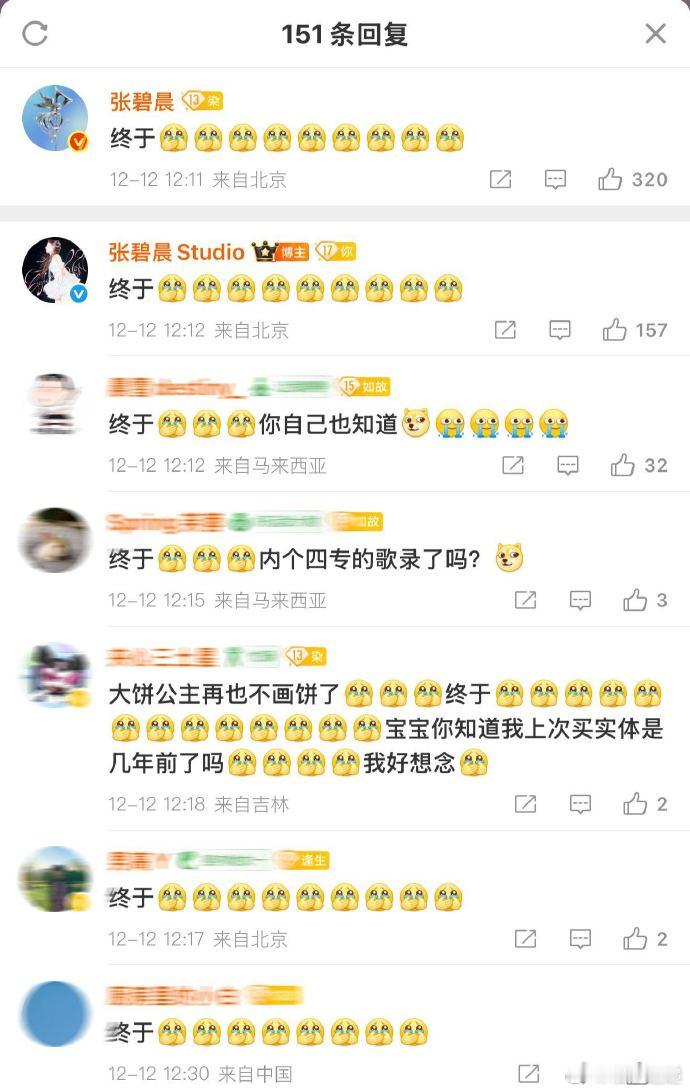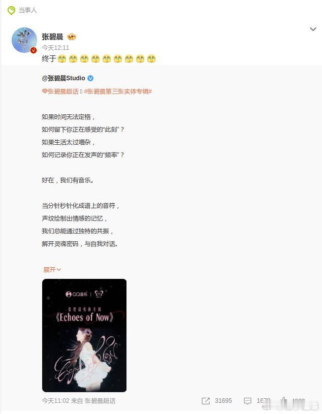 张碧晨连发9个捂嘴哭 原来是因为她的第三张实体专辑《Echoes of Now》终于开启预约了!这份等了又等的激动,化成了一连串的表情刷屏。对于歌手来说,实体专辑的意义确实不一样,难怪粉丝也集体共鸣:“我们懂的!” 恭喜姐姐,新专大卖!