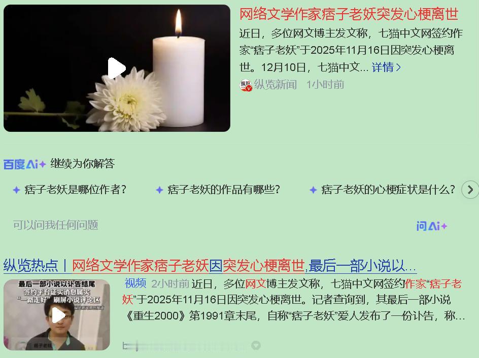 看到“痞子老妖”猝死的消息,真堵得慌。大伙儿都在叹又一个写手累倒了,但这哪是意外?这分明是整个行业睁只眼闭只眼的“慢性谋杀”。 起“痞子”这种笔名,多半是硬扛的草根作者。看看他的更新:一本书写了快2000章,几百万字。免费平台靠什么活?流量。流量怎么来?就得逼作者往死里更新。平台不会明说,但规则摆那儿:更得少,就没推荐,没收入。这根本是一份卖命合同。 最讽刺的是,他最后更新的章节,是爱人替他发的讣告。一个作者的结局,竟然不是小说的尾声,而是自己的死讯。平台后来才跟上一条公告。人活着的时候是流量工具,走了,就成了一个需要处理的“通知”。 别再用“梦想”骗人了。网文圈总灌“用爱发电”的毒鸡汤,可心梗是写出来的,是长期熬夜、焦虑、高压的代价。这行太喜欢把作者当耗材了。 平台赚得盆满钵满,责任尽到了吗?除了分钱和事后发条公告,有没有真心保障作者的健康?有没有应对意外的机制?事前预防永远比事后悼念重要。 说点实在的,如果你是写手: 身体永远是第一位。定闹钟活动,定期体检,别硬撑。你的读者不想在章末看到讣告。 看懂合同,稿酬、社保、版权,心里得有数。 别把命拴在一个平台上。多几条路,多点保障。 “痞子老妖”不是个例。他是无数困在系统里的创作者的影子。我们哀悼一个生命,更该警惕这种把人当数据、当工具的冰冷逻辑。 这个行业,需要的不只是爆款和流量,更需要让认真创作的人,能健康、有尊严地活下去的规则。这才是真正的正能量,也是对逝者最好的交代。