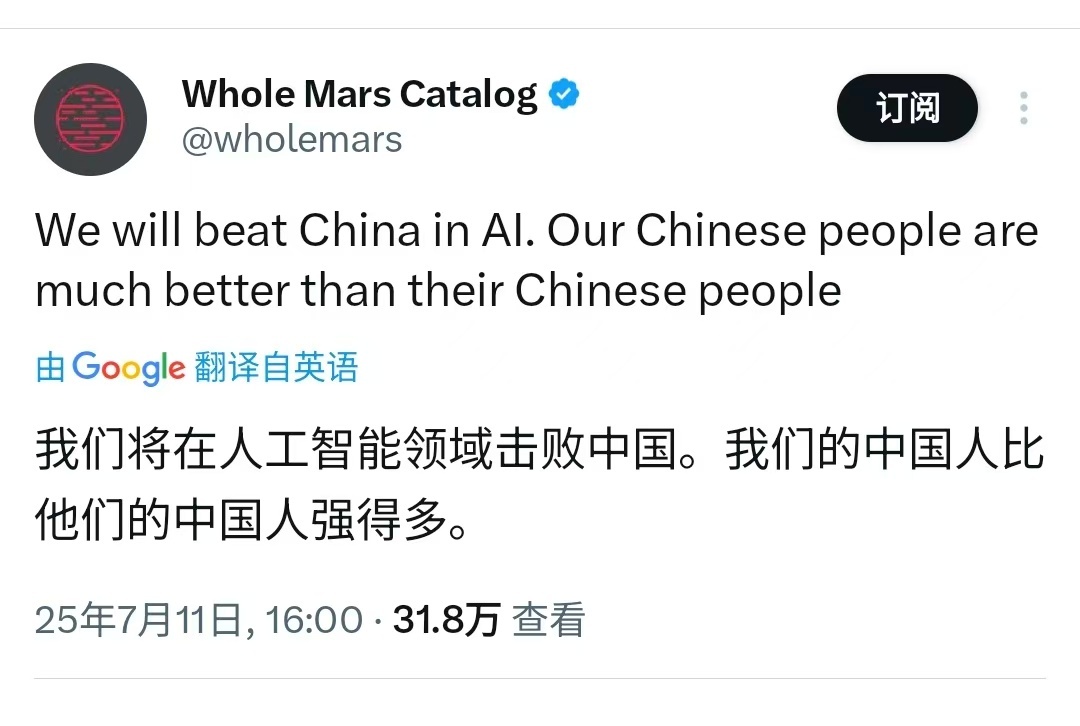 中华民族从来不缺创新思维,几千年的持续探索和积淀,在明朝时期达到了顶峰,领先世界很长的距离。满清有计划的焚毀各种技术类书籍和愚民统治,大幅降低了整体识字率,把前人积累的优势拱手送给了欧洲。1840年以来,无数的中国人用生命、鲜血和永不放弃的精神,经过180多年的艰苦努力和不断尝试,终于恢复了民族自信和创新能力,即将重回世界之巅,引领全球。在这个伟大复兴的进程中,有些人仍然被美西方的幻象所忽悠和蒙蔽,他们甘心充当渗透的工具,为小利而失大义,逆潮流而跪拜葡服,妄图引“狼”入室,混淆是非,祸乱治理,毁百姓安宁,坏复兴大局。此等人与满清封建统治者无异,与明末那些出卖文化古籍给传教士的江南士绅同流,他们是无家无国之人,无族无宗之后,是唯利是图的文化汉奸。当下国人,早已是站起来抬头平视世界的自信群体,是信心百倍的复兴大业参与者,奉献者,见证者。看看世界排名前十的研究机构,前10中有8个来自中国,他们跪拜的欧洲已经掉队。马斯克解雇了的Grok项目Al研发团队里的最后一个白人,这占比极高的中国人面孔,不正是向世界宣示,聪明睿智创新能力爆棚的中国人又回来了,虽然他们幻想能够用中国人“击败”中国。中方提3个绝不允许中国战斗机和周边国家间形成代差
