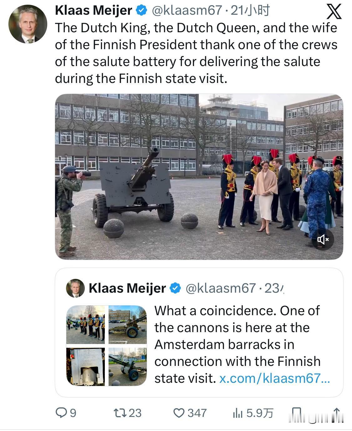 12月11日,芬兰总统亚历山大·斯图布(Alexander Stubb)及其夫人苏珊娜·英尼斯-斯图布(Suzanne Innes-Stubb)对荷兰进行了国事访问,在荷兰国王威廉-亚历山大(King Willem-Alexander)和马克西玛王后(Queen Máxima)举行的欢迎仪式上,礼炮鸣放是芬兰总统国事访问荷兰官方欢迎仪式的一部分,该仪式于2025年12月11日在荷兰阿姆斯特丹水坝广场(Dam Square in Amsterdam)举行。 在相关活动中,荷兰国王威廉-亚历山大、王后马克西玛以及芬兰总统的夫人(芬兰现任总统亚历山大·斯图布的夫人是苏珊娜·英尼斯-斯图布)对礼炮兵连的成员表示了感谢。这种互动体现了两国之间的友好关系和对军事礼仪的尊重。