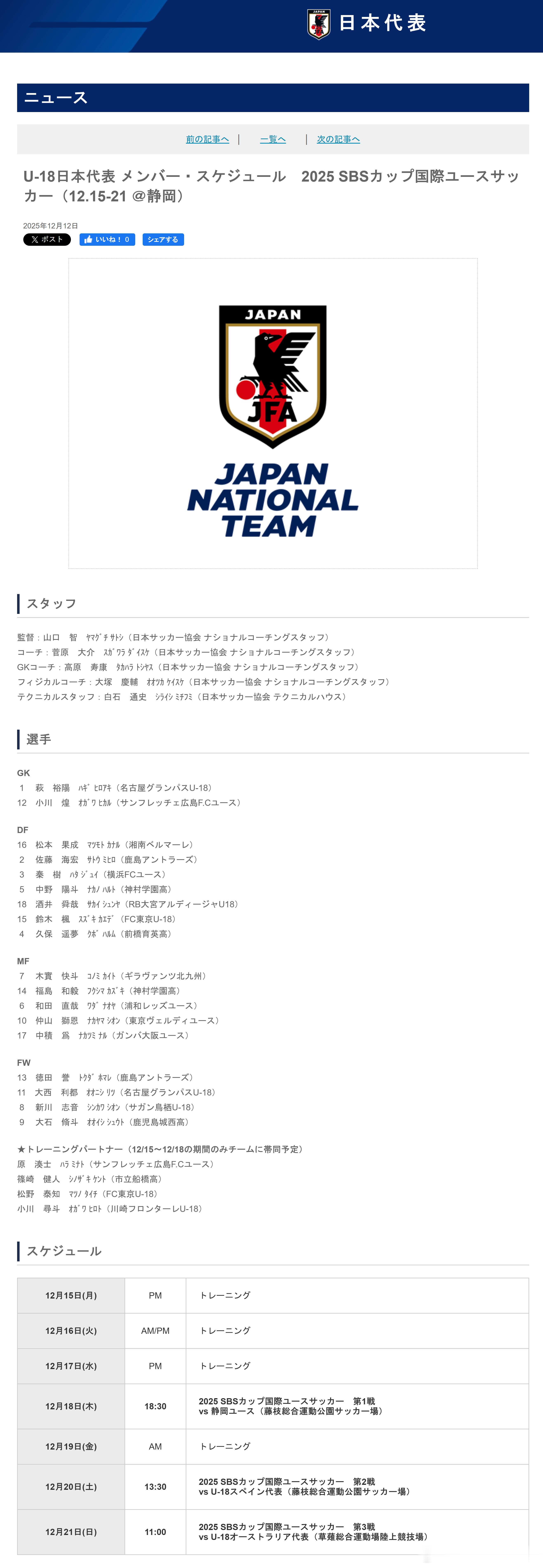 育成年代(895):12月12日,日本足协(JFA)公布了即将参加于12月15日-21日在静岡举行的2025 SBS杯国际青年足球锦标赛(2024 SBS Cup International Youth Soccer)的 成员名单和赛程表。【赛程表】第1戦北京时间12月18日17:30, 藤枝総合運動公園蹴球場; vs 静岡青年队第2戦北京时间12月20日12:30, 藤枝総合運動公園蹴球場; vs U18西班牙国家队第3戦北京时间12月21日10:00, 草薙総合運動場陸上競技場; vs U18澳大利亚国家队【工作人员】監督:山口 智(日本蹴球協会 国家教练组)教练:菅原 大介(日本蹴球協会 国家教练组)守门员教练:高原 寿康(日本蹴球協会 国家教练组)体能教练:大塚 慶輔(日本蹴球協会 体能项目)技术人员:白石 通史(日本蹴球協会 技术屋)【選手】守门员GK1 萩 裕陽(HAGI Hiroaki,名古屋Grampus U-18)12 小川 煌(OGAWA Hikaru,Sanfrecce広島F.C Youth)后卫DF16 松本 果成(MATSUMOTO Kanaru, 湘南Bellmare) 2 佐藤 海宏(SATO Mihiro, 鹿島Antlers) 3 秦 樹(HATA Jui, 横浜FC Youth) 5 中野 陽斗(NAKANO Haruto, 神村学園高)18 酒井 舜哉(SAKAI Shunya, RB大宮Ardija U18)15 鈴木 楓(SUZUKI Kaede, FC東京U-18) 4 久保 遥夢(KUBO Harumu, 前橋育英高)中场MF7 木實 快斗(KONOMI Kaito, Giravanz北九州)14 福島 和毅(FUKUSHIMA Kazuki, 神村学園高) 6 和田 直哉(WADA Naoya, 浦和Reds Youth)10 仲山 獅恩(NAKAYAMA Shion, 東京Verdy Youth)17 中積 爲(NAKATSUMI Naru, Gamba大阪Youth)前锋FW13 徳田 誉(TOKUDA Homare, 鹿島Antlers)11 大西 利都(ONISHI Ritsu, 名古屋Grampus U-18) 8 新川 志音(SHINKAWA Shion, Sagan鳥栖U-18) 9 大石 脩斗(OISHI Shuto, 鹿児島城西高)