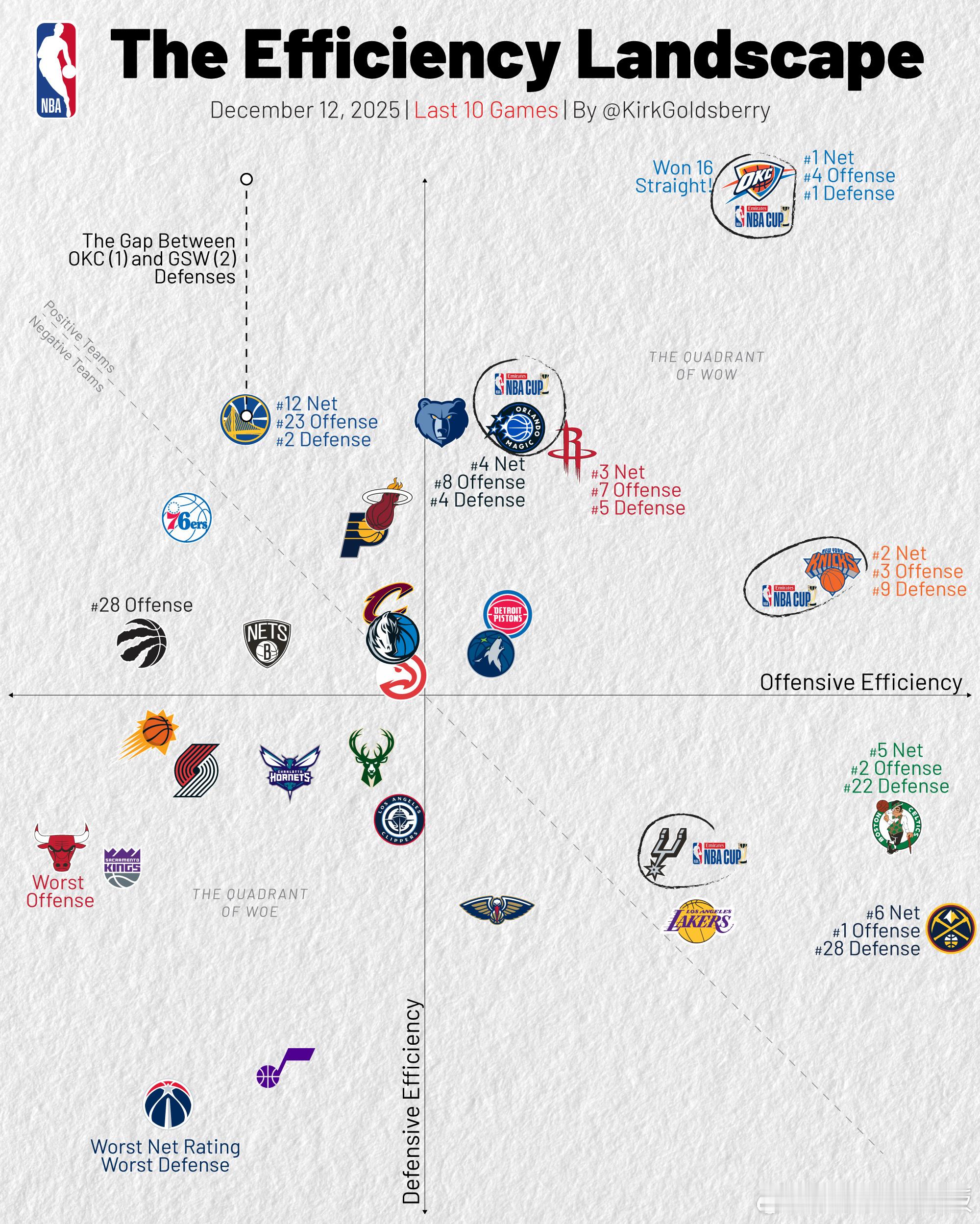最近10场比赛各队攻防表现(横轴进攻,纵轴防守)雷霆净效率第1&防守断档第1,尼克斯净效率第2,火箭第3,公牛进攻倒数第1📉湖人进攻5&防守27,掘金进攻1&防守28,同属攻强守弱新赛季篮不住