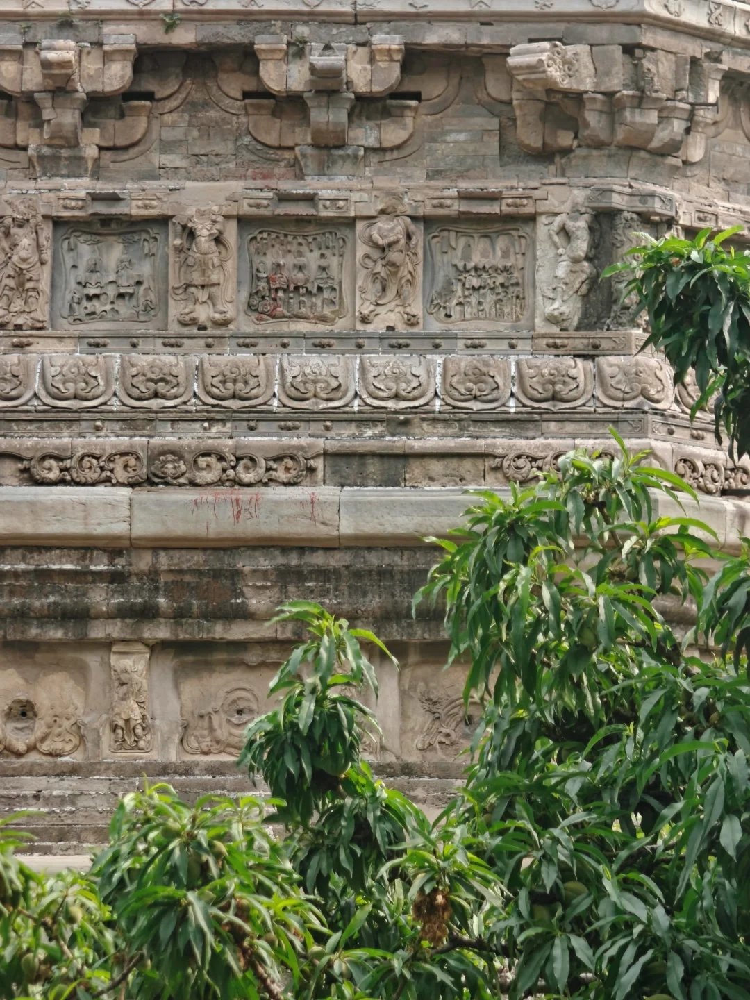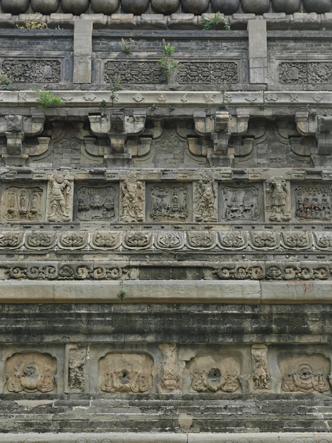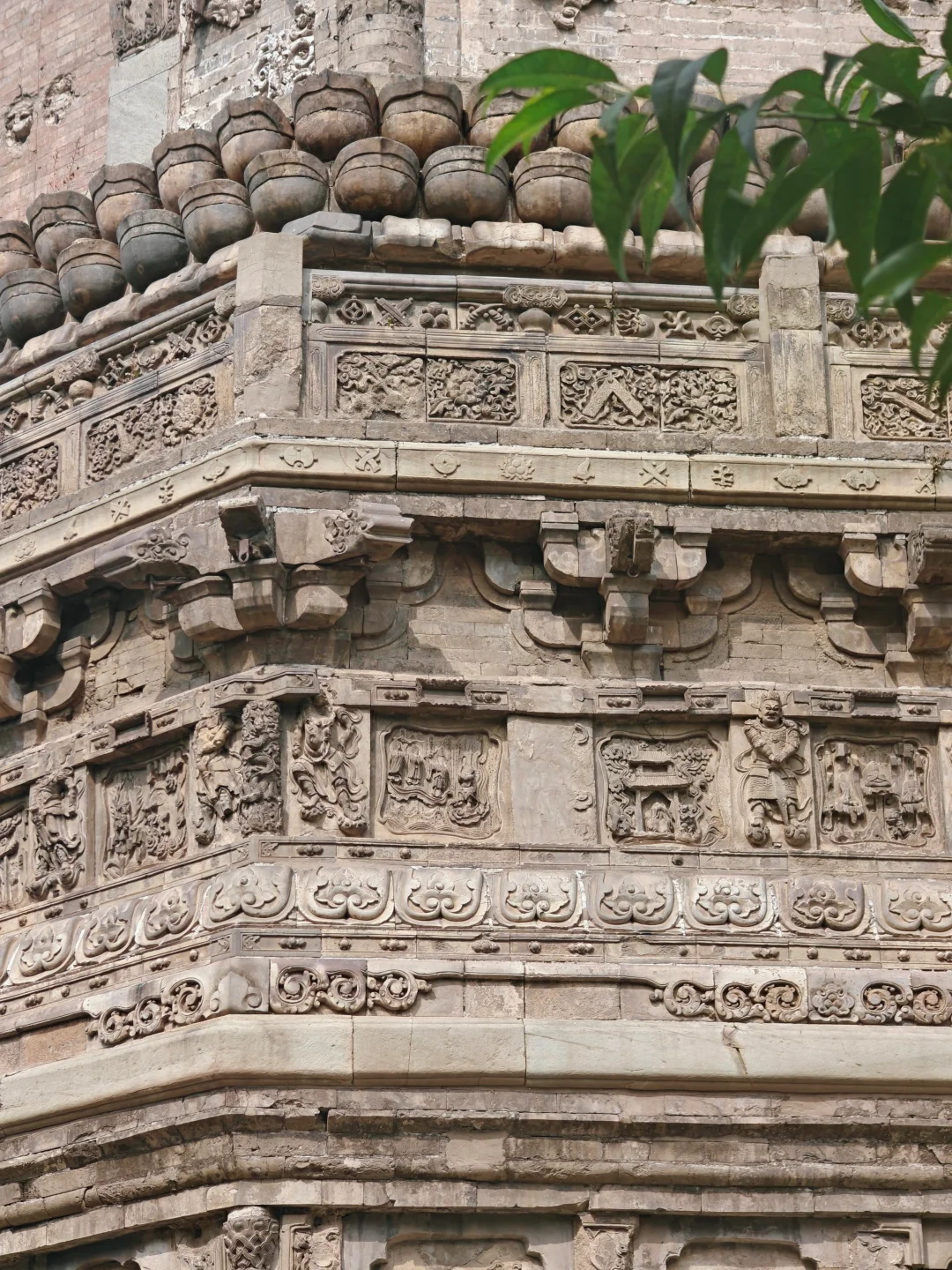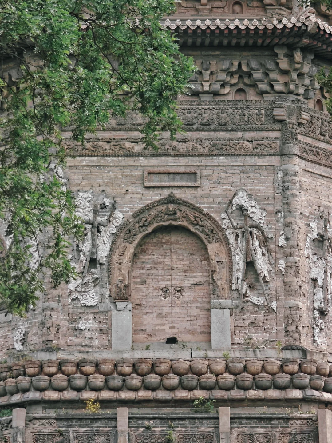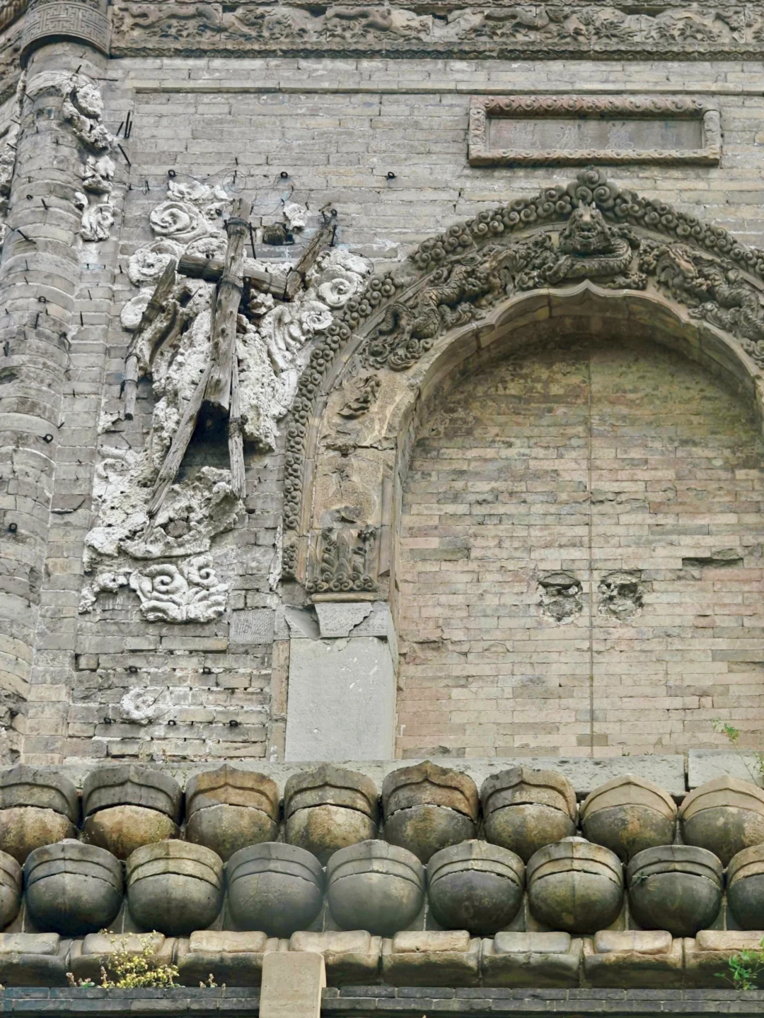 🛕塔基束腰处为仰莲瓣,塔身转角处的砖柱上浮雕升降龙,须弥座砖雕十分精美,可惜佛像的头部几乎全被凿去了,人为破坏痕迹明显
