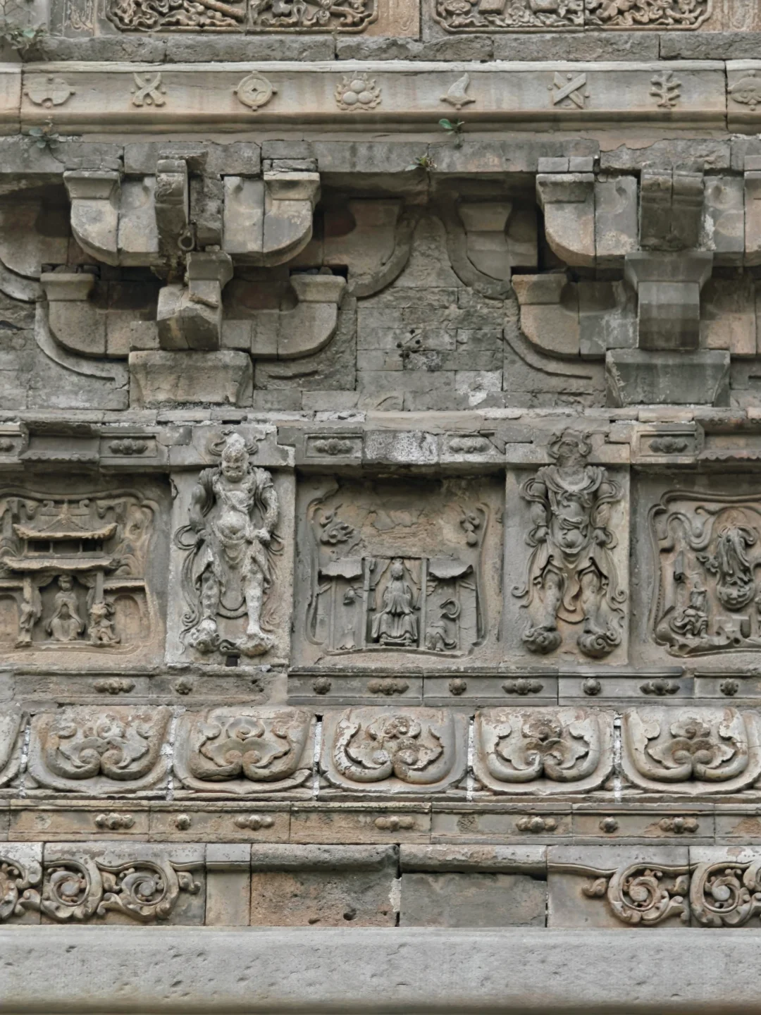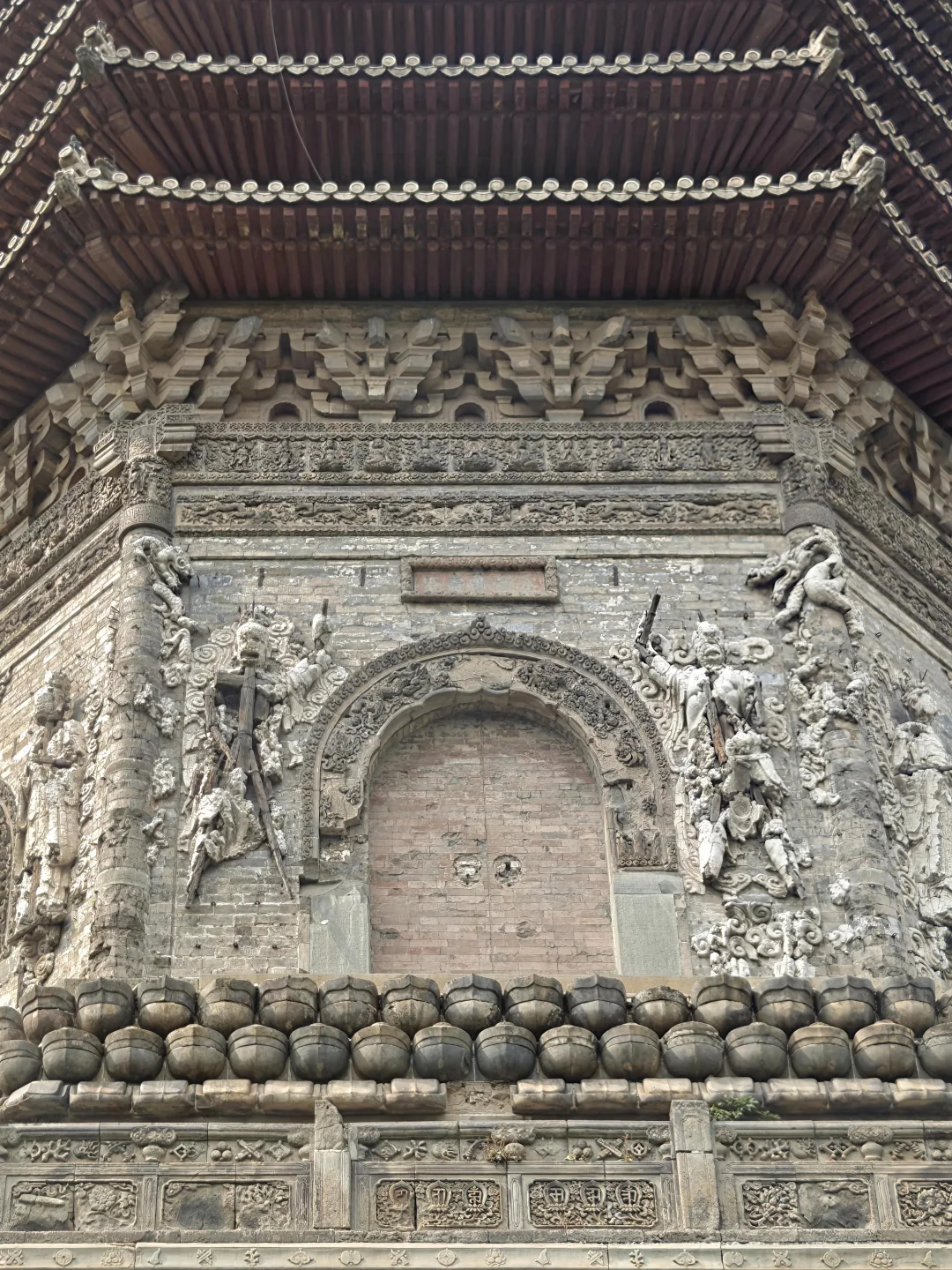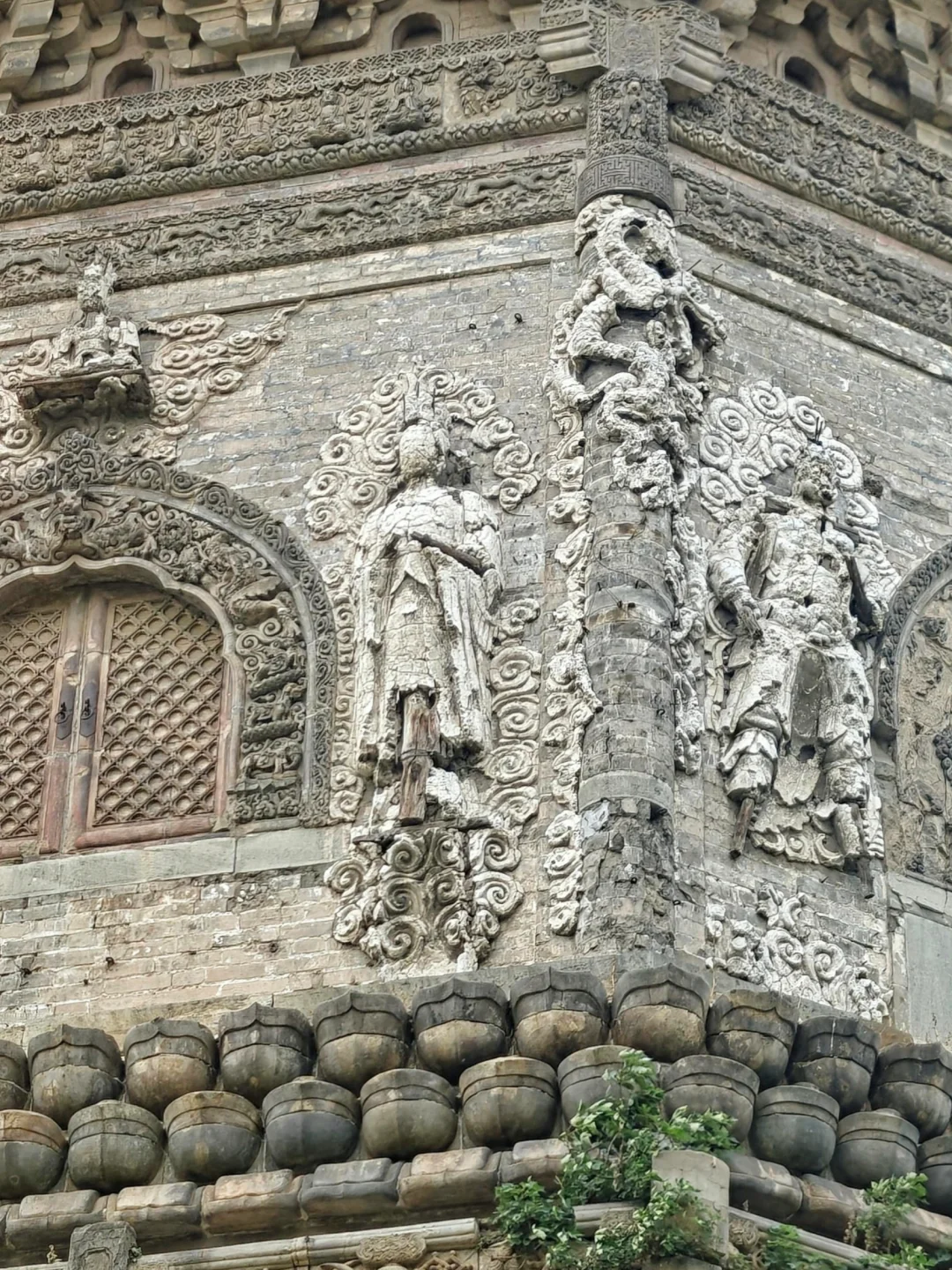 🛕门窗上部和两侧高浮雕金刚力士、菩萨、天部等神像。一百年前的黑白照片上还可见完整的面容,如今脸部几乎没有完整的了,有几个风化剥落程度严重到只剩内部木架子了,并且近些年风化速度很快,看一眼少一眼
