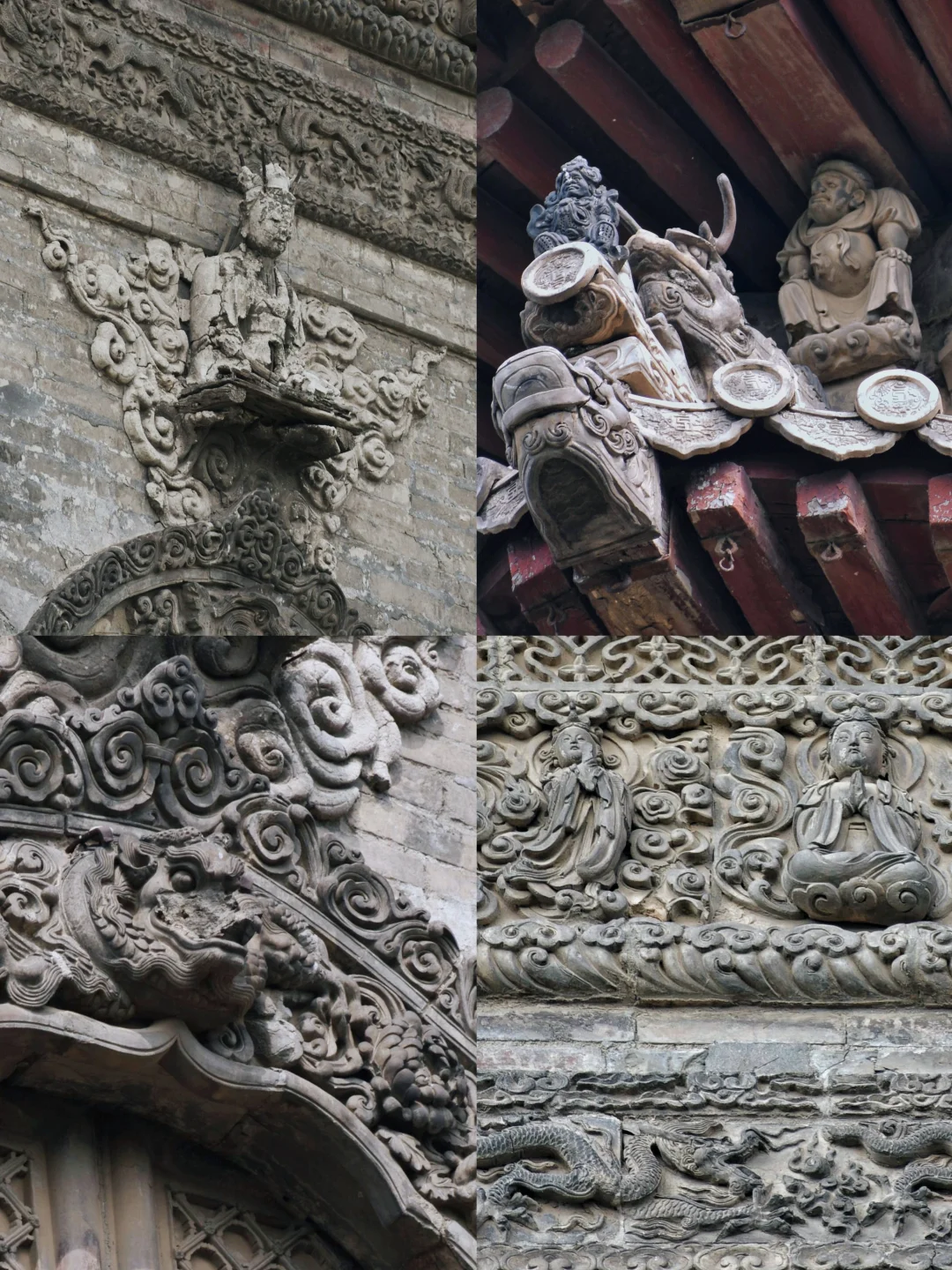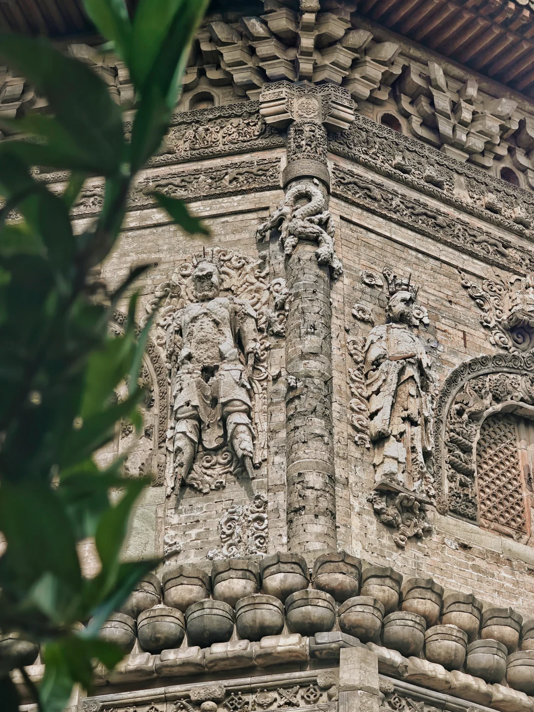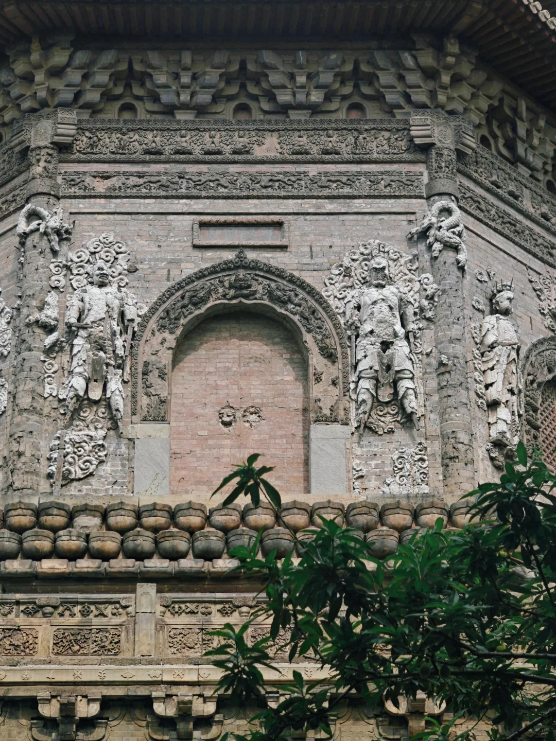 🛕门窗上部和两侧高浮雕金刚力士、菩萨、天部等神像。一百年前的黑白照片上还可见完整的面容,如今脸部几乎没有完整的了,有几个风化剥落程度严重到只剩内部木架子了,并且近些年风化速度很快,看一眼少一眼