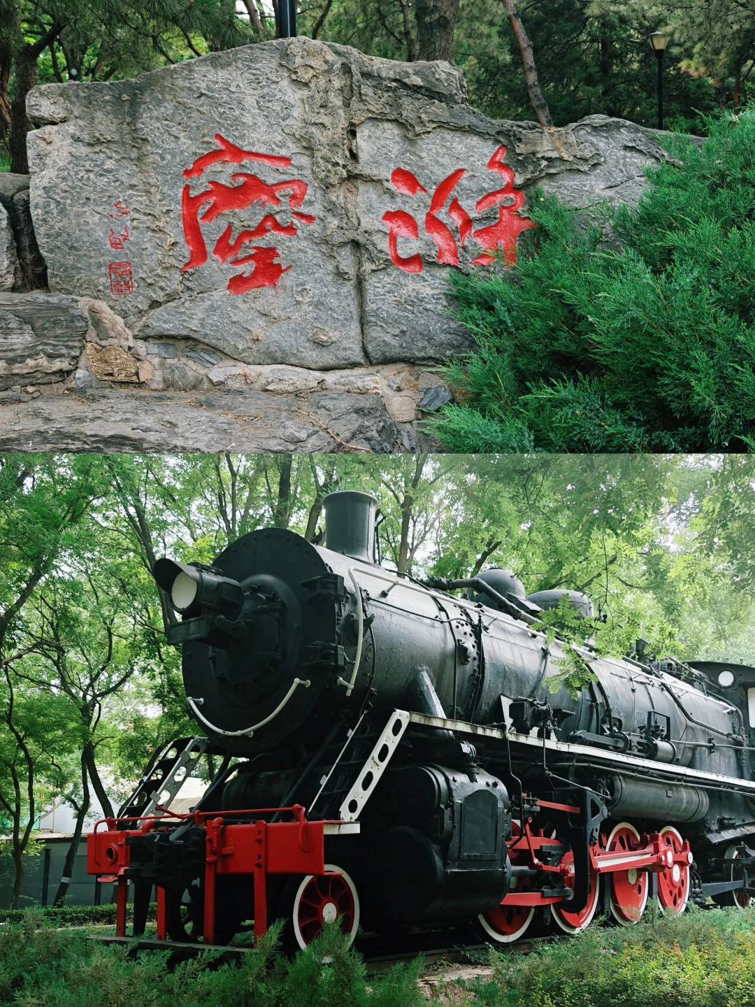 ⛲️玲珑公园其他看点:火车头广场陈列1937年日本蒸汽机车及老式车厢;中心湖区与鉴池倒映塔影,四季景致各异