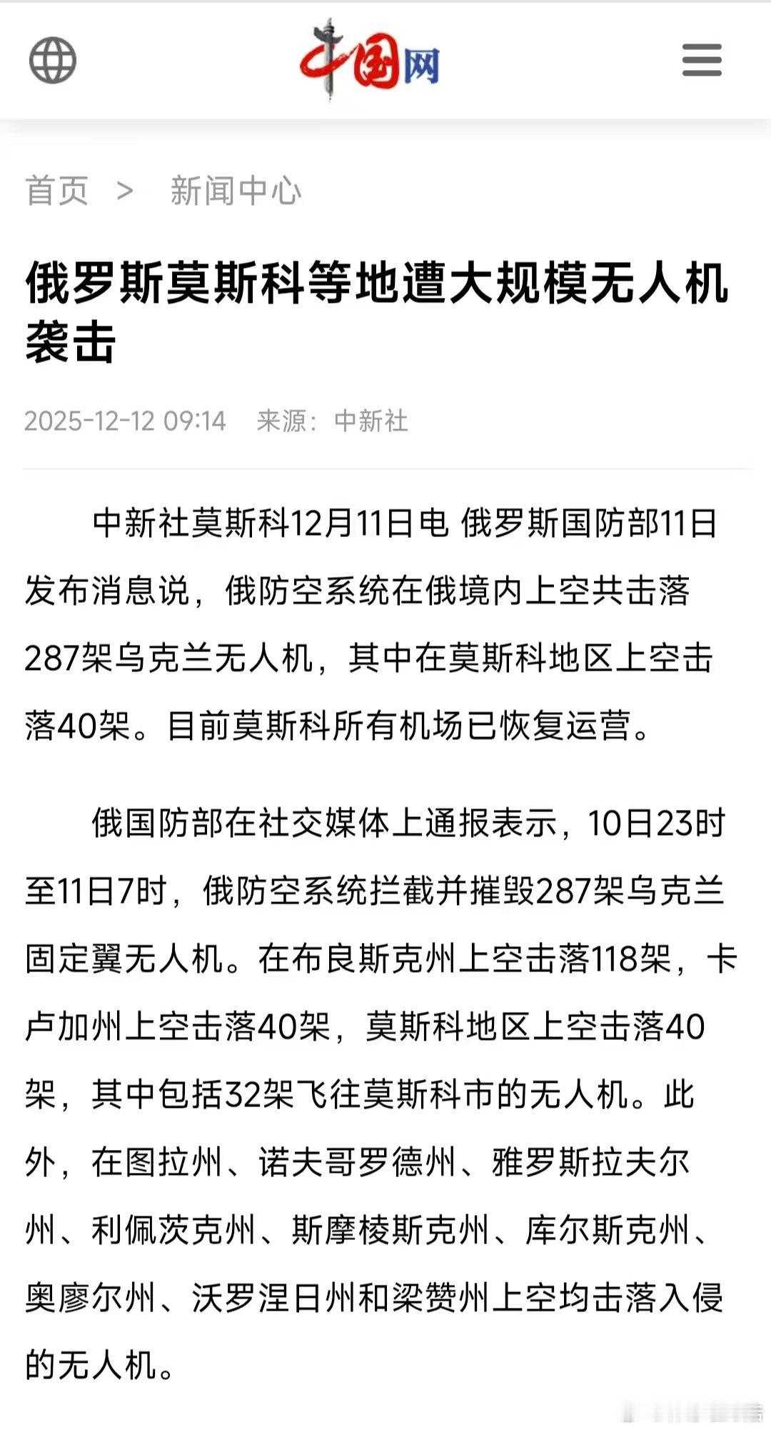12月11日清晨,乌克兰出动数百架无人机对莫斯科实施大规模袭击。俄方