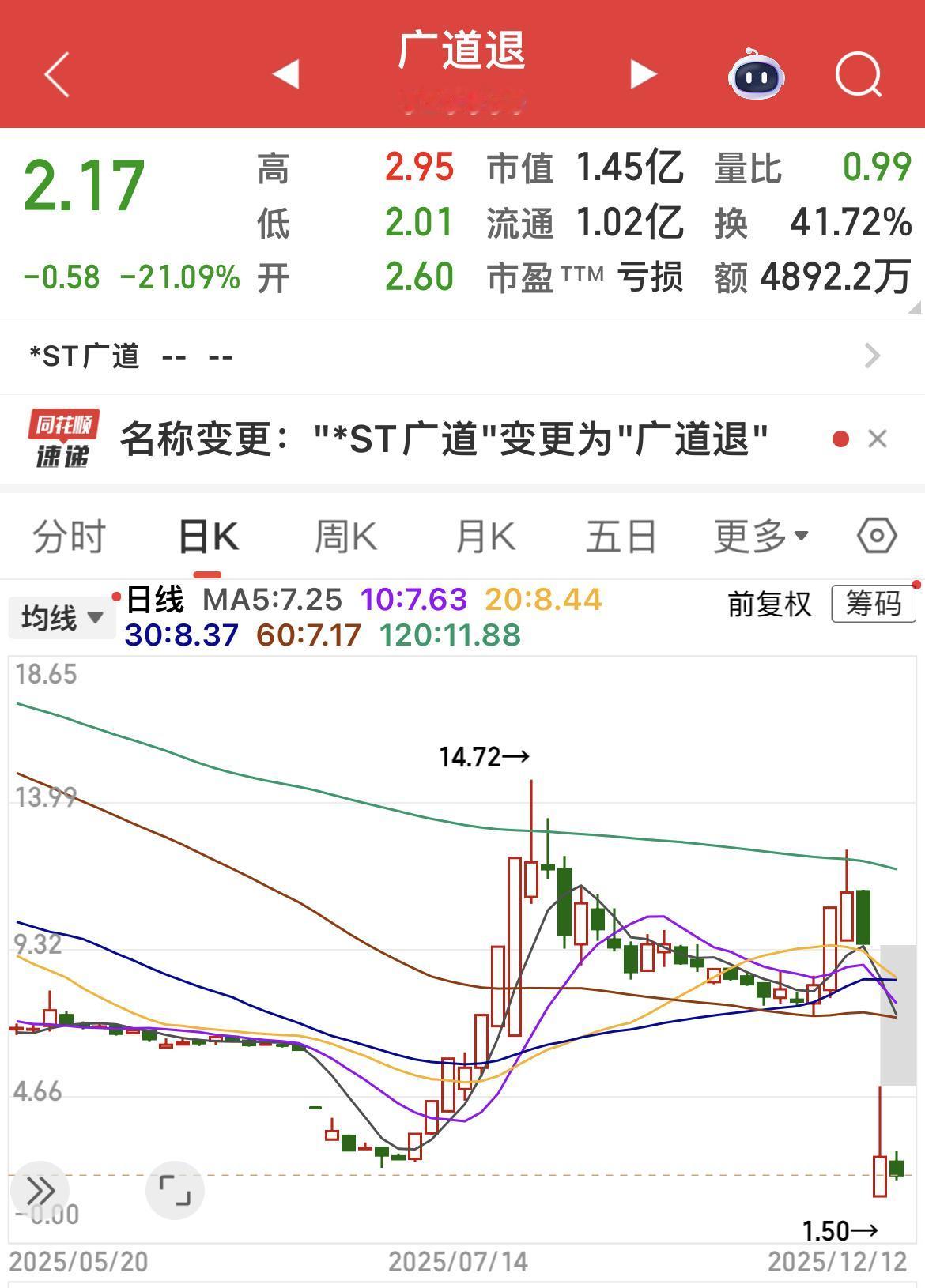 广道退:近三个交易日分别跌幅14.54 %、71.11 %、21.09 %! 该公司连续7年财务造假,被强制退市! 该股在发布强制退市风险后,却连续九个交易日上涨5倍多(北交所涨幅为30 cm),股票从2.42元涨到14.72元,荒诞至极! 而近三个交易日分别跌幅14.54 %、71.11 %、21.09 %! 只剩下18个交易日退市摘牌了!