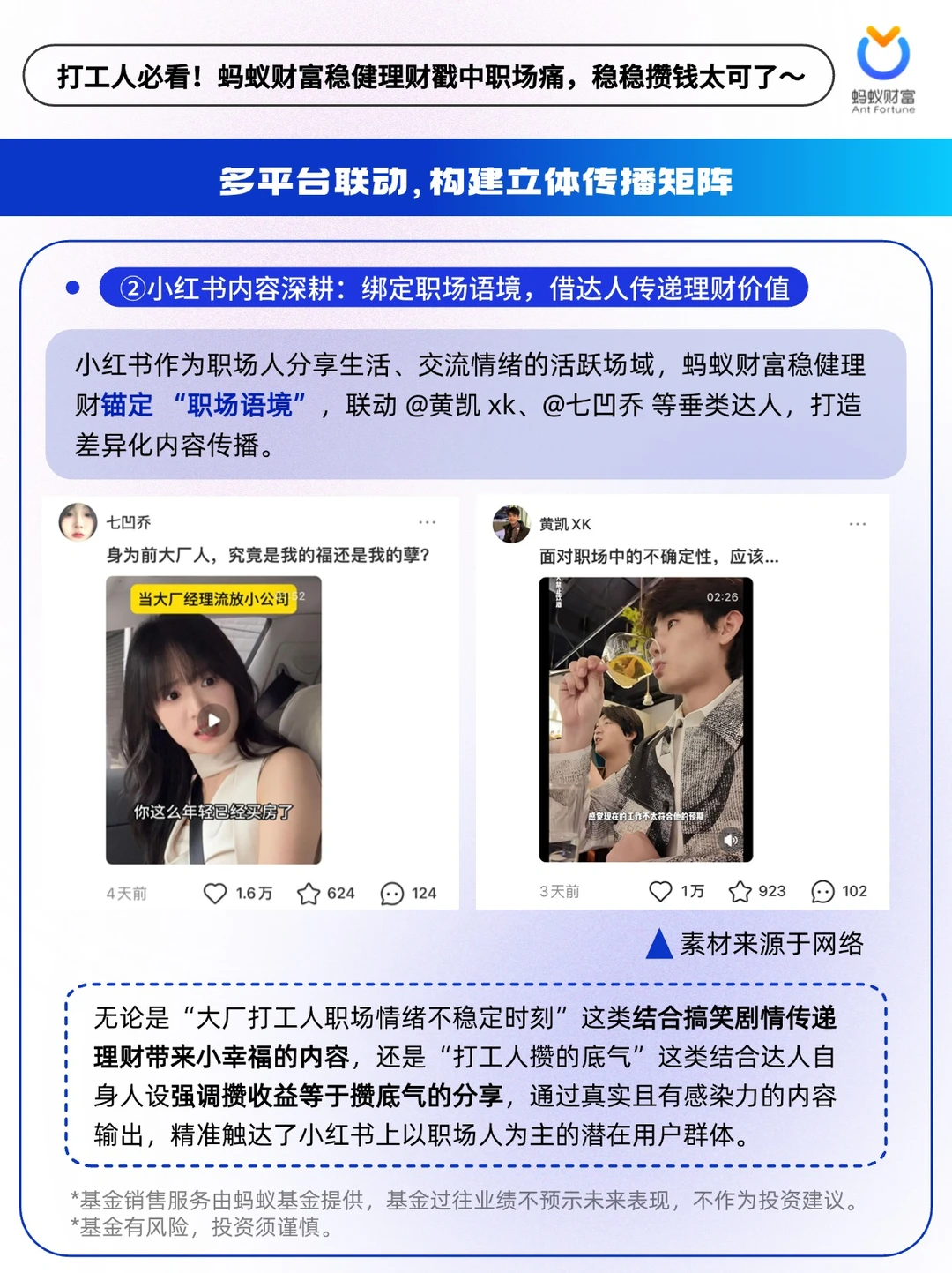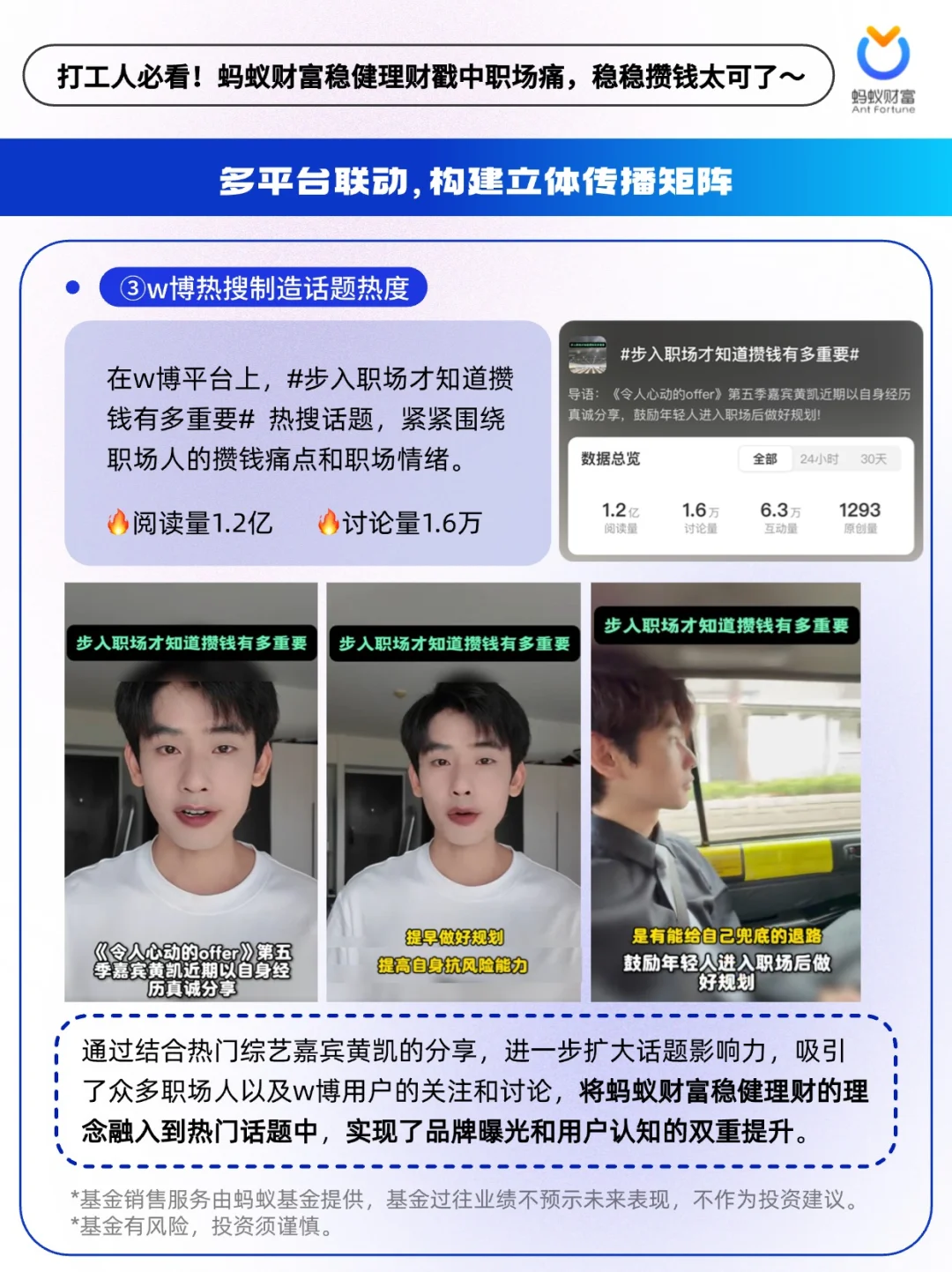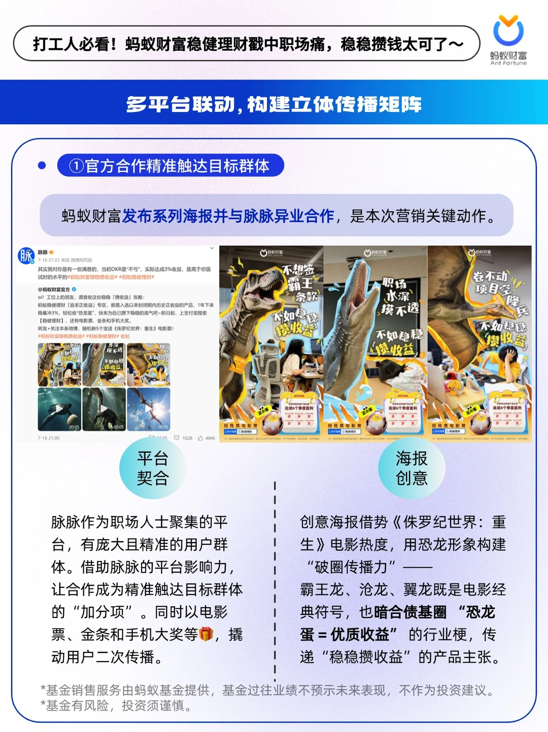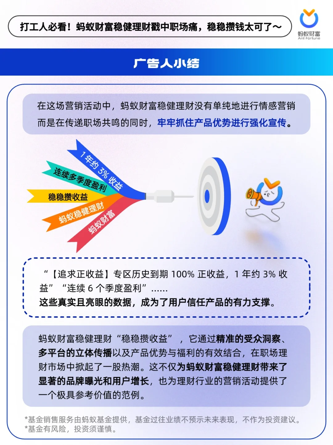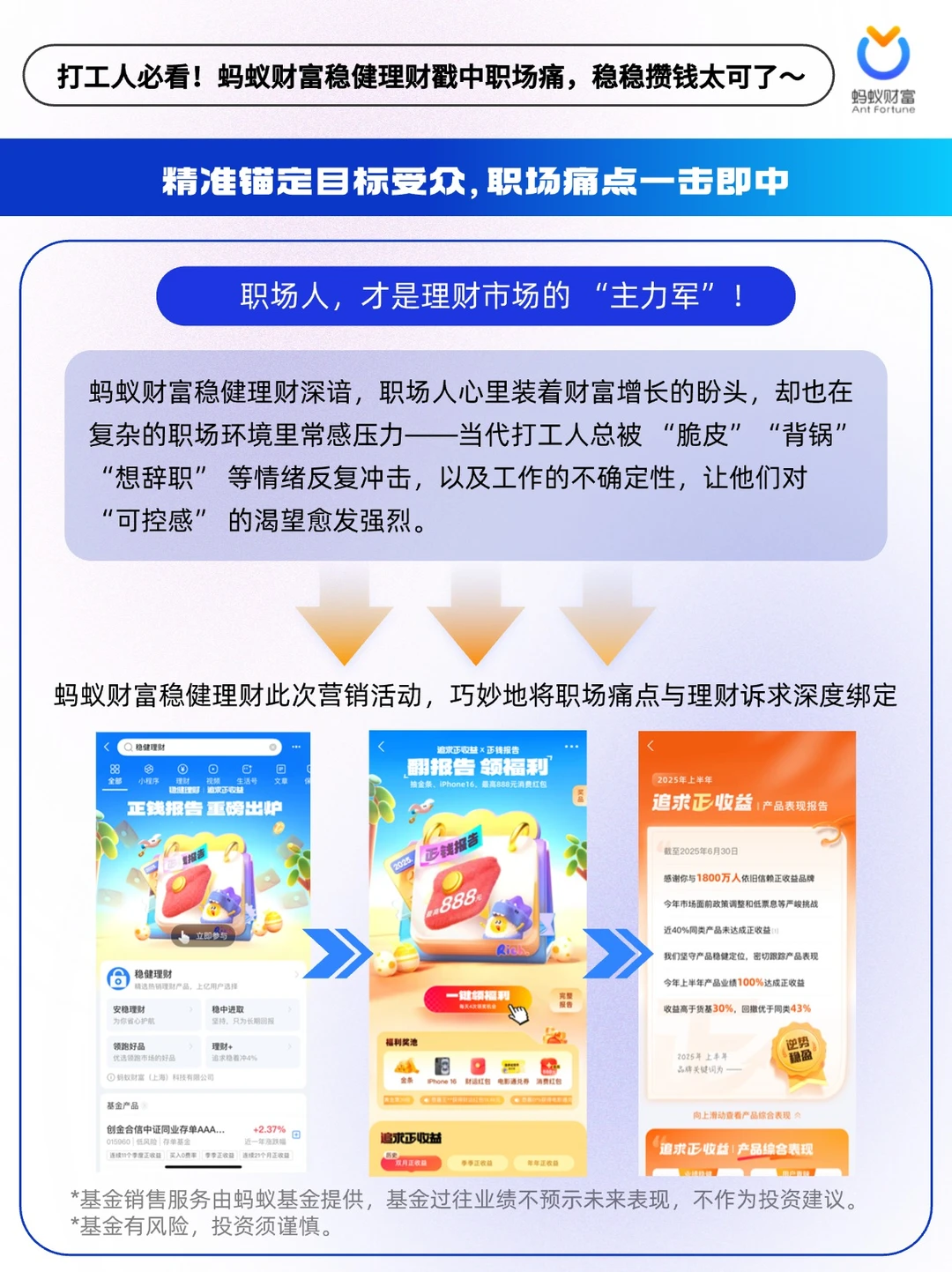 🔵蚂蚁财富稳健理财洞察到打工人的攒钱痛点与理财诉求,并将二者深度绑定,围绕“攒钱”到“攒收益”的时代变化,放大追求正收益的产品核心优势,将“稳稳攒收益””正收益“巧妙植入用户心智。