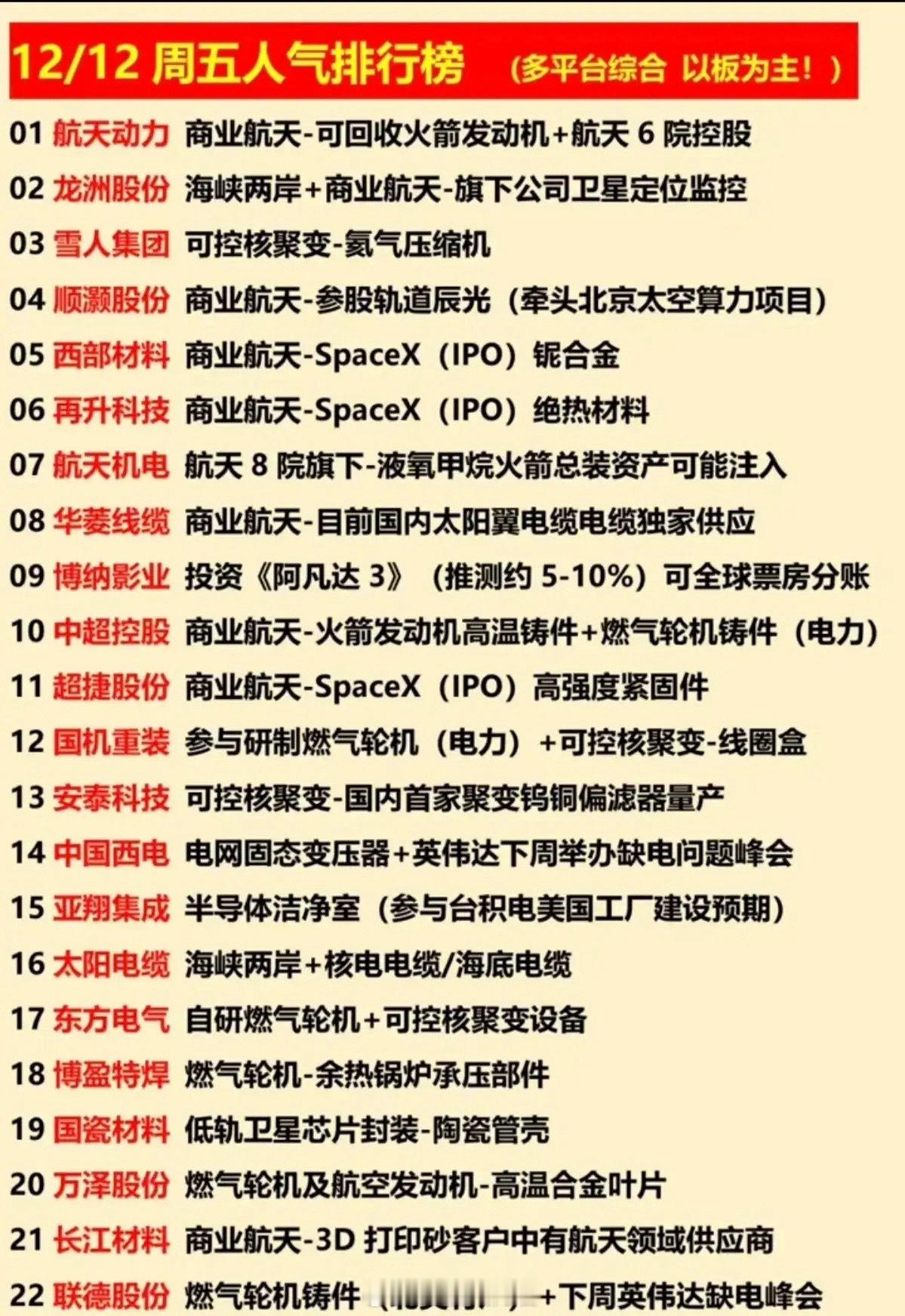 12月12日人气排行榜梳理分析本次梳理综合多平台数据,以涨停板为核心观察维度,清晰显示商业航天是当前绝对主线——超半数上榜个股覆盖该赛道的材料、零部件、整机及细分应用环节,叠加SpaceX IPO、可回收火箭等热点持续发酵;可控核聚变、燃气轮机/电力、半导体及海峡两岸、英伟达缺电峰会等主题同步受关注,上榜个股多为赛道细分核心标的,反映市场对高端制造硬核赛道的高度追捧。个股梳理分析1. 航天动力:商业航天核心标的,主打可回收火箭发动机,由航天6院控股,依托航天院所技术背景,成为商业航天领域的核心人气龙头,赛道地位突出。2. 龙洲股份:叠加海峡两岸与商业航天概念,旗下公司涉及卫星定位监控业务,区域题材与热门赛道形成共振,凭借题材叠加效应获高关注度。3. 雪人集团:聚焦可控核聚变赛道,核心产品为氦气压缩机,作为核聚变领域关键设备供应商,赛道稀缺性推高市场人气。4. 顺灏股份:主打商业航天,参股轨道辰光并牵头北京太空算力项目,卡位太空算力这一商业航天新兴细分方向,成为赛道内人气标的。5. 西部材料:绑定商业航天与SpaceX IPO概念,核心产品铌合金是航天特种金属材料的重要供应商,赛道与国际热点叠加提升人气。6. 再升科技:聚焦商业航天与SpaceX IPO,核心为绝热材料,作为航天装备关键材料供应商,材料端核心地位获市场关注。7. 航天机电:隶属航天8院,有液氧甲烷火箭总装资产注入预期,背靠航天院所叠加资产整合预期,成为商业航天人气标的。8. 华菱线缆:商业航天核心标的,国内太阳翼电缆独家供应商,产品独家属性使其成为商业航天配套领域人气股。9. 博纳影业:因投资《阿凡达3》(推测占比5%-10%)可参与全球票房分账,影视IP热度使其在硬核赛道榜单中占据一席之地。10. 中超控股:叠加商业航天与电力概念,主营火箭发动机高温铸件、燃气轮机铸件,作为航天与电力装备核心零部件供应商,双赛道加持获关注。11. 超捷股份:绑定商业航天与SpaceX IPO,主营高强度紧固件,是航天装备核心零部件供应商,细分领域核心地位推高人气。12. 国机重装:叠加电力与可控核聚变概念,参与燃气轮机研制且主营核聚变线圈盒,双赛道布局成为高端制造人气标的。13. 安泰科技:聚焦可控核聚变,国内首家实现聚变钨铜偏滤器量产的企业,技术量产优势使其成为核聚变赛道人气股。14. 中国西电:主打电网固态变压器,叠加英伟达下周缺电问题峰会主题,电力设备与科技峰会热点共振获市场关注。15. 亚翔集成:聚焦半导体洁净室,有参与台积电美国工厂建设的预期,半导体基建核心属性使其成为赛道人气标的。16. 太阳电缆:叠加海峡两岸与核电/海底电缆概念,区域题材与电力装备赛道共振,成为线缆领域人气标的。17. 东方电气:自研燃气轮机且布局可控核聚变设备,高端装备制造与核聚变赛道双布局,获市场高关注度。18. 博盈特焊:主打燃气轮机领域,主营余热锅炉承压部件,作为燃气轮机装备核心配套商,细分领域优势推高人气。19. 国瓷材料:聚焦低轨卫星芯片封装,主营陶瓷管壳,是卫星芯片封装核心材料供应商,卡位航天半导体细分赛道获关注。20. 万泽股份:布局燃气轮机及航空发动机,主营高温合金叶片,作为高端发动机核心零部件供应商,硬核制造属性获人气。21. 长江材料:主打商业航天,其3D打印砂客户包含航天领域供应商,间接卡位商业航天供应链,获市场关注。22. 联德股份:主营燃气轮机铸件且北美有生产基地,叠加英伟达下周缺电峰会主题,赛道与热点事件共振成为人气标的。总结今日人气榜凸显商业航天的核心主线地位,产业链上下游及新兴细分(如太空算力)标的均获高关注,叠加SpaceX IPO、院所资产注入等预期的标的更受青睐;可控核聚变、燃气轮机/电力等高端制造赛道同步分流人气,而区域题材、行业峰会等事件性主题与硬核赛道的叠加,进一步放大了个股关注度。本文涉及资讯、数据等内容来自网络公共信息,仅供参考,不构成投资建议!
