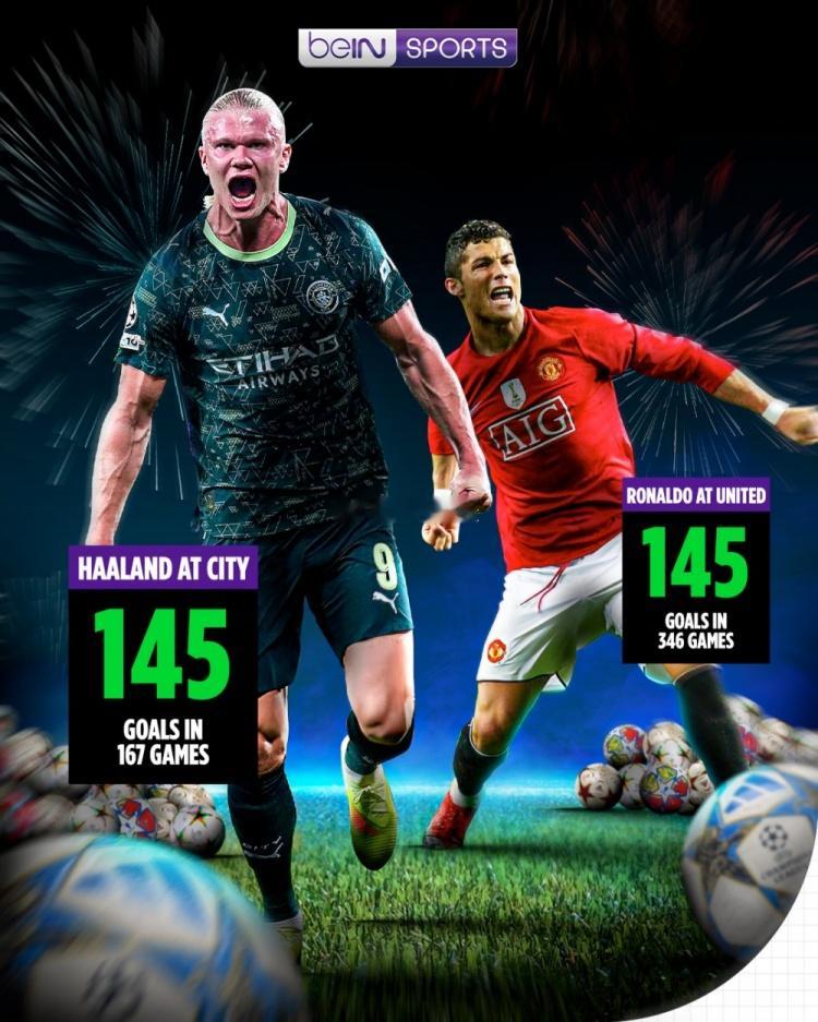 C罗和哈兰德都被誉为这个时代的进球机器。目前的C罗正在沙特联赛冲击千球纪录,而哈兰德则在英超碾碎所有的进球纪录。据beinsport数据统计,哈兰德如今已经在曼城打进的进球数追平了C罗在曼联时期的总进球数,而且他所用的比赛场次不到C罗的一半!C罗和哈兰德分别代表曼联和曼城的数据:C罗 曼联 346场 145球哈兰德 曼城 167场 145球