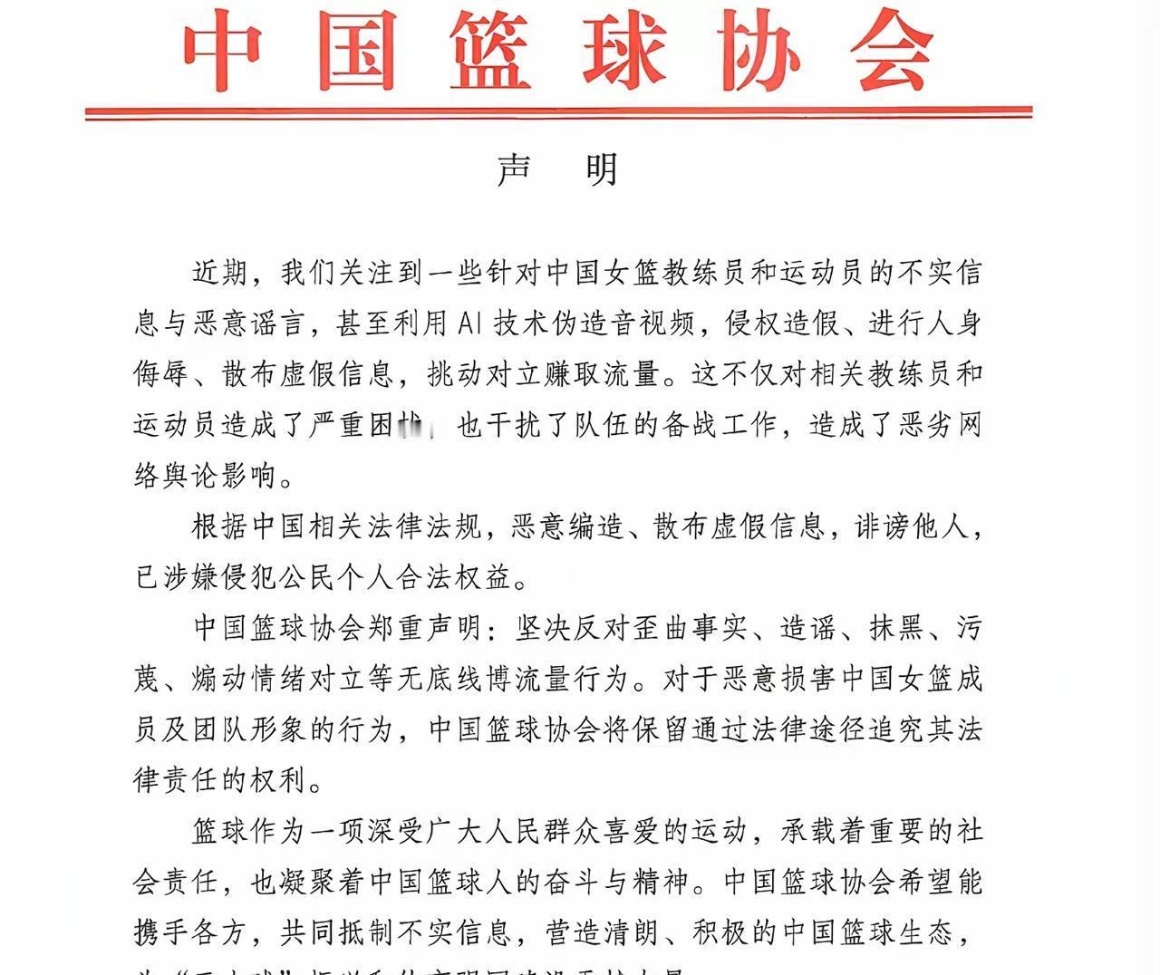 AI伪造王思雨视频露馅了,竟把“一百五十次”读成“幺伍零次”。 这个破绽让整个谣言瞬间崩塌。 中国篮协的声明已经贴出法律利剑。 网信部门同步启动专项行动,专治AI伪造运动员声音图像的“数码鬼影”。 王思雨本人转发澄清,手指一划切断谣言传播链。 68岁的宫鲁鸣教练照常带队训练。 女篮姑娘们正在打磨巴黎奥运会的入场券,训练馆里只有篮球击地和战术指令的声音。 宫指导说,法庭会理清是非,球场只管胜负。 技术可以伪造声纹,但伪造不了一支球队的呼吸节奏。 谣言试图制造裂痕时,真正坚固的东西正在沉默中生长——那是法律织成的防护网,是运动员点击发送的辟谣键,是老教练走向训练场的每一步。 键盘侠用代码编造剧情,奋斗者用汗水书写剧本。 当你在屏幕前划到这条消息,你已经是真相传递链上的一环。